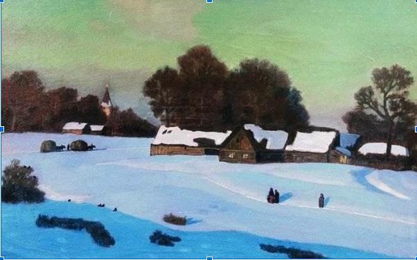 На этой картине Крымова "Зимний вечер" он изобразил зимнюю деревню в вечернее время суток. Крыши деревенский домов завалены снегом. На небе виден красивый закат. Солнце уже скрылось за горизонтом, но небо все ещё светлое.