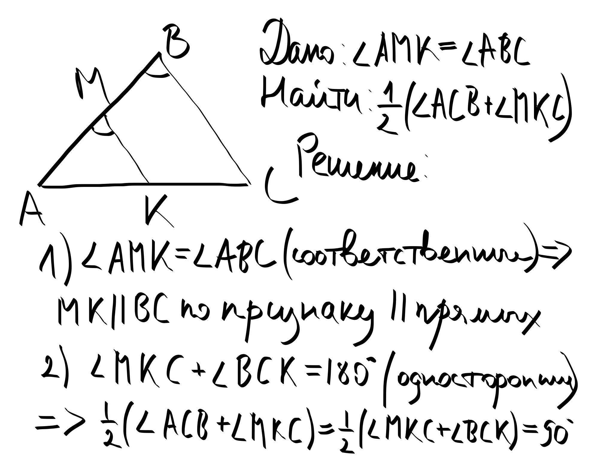 рассмотрим теже прямые, но секущую КС ⇒ ∠MKC +∠KCB = 180 т.к. это односторонние углы при параллельных прямых, значит 1/2(∠MKC +∠KCB) = 1/2 (∠MKC +∠АCB) = 1/2*180 = 90