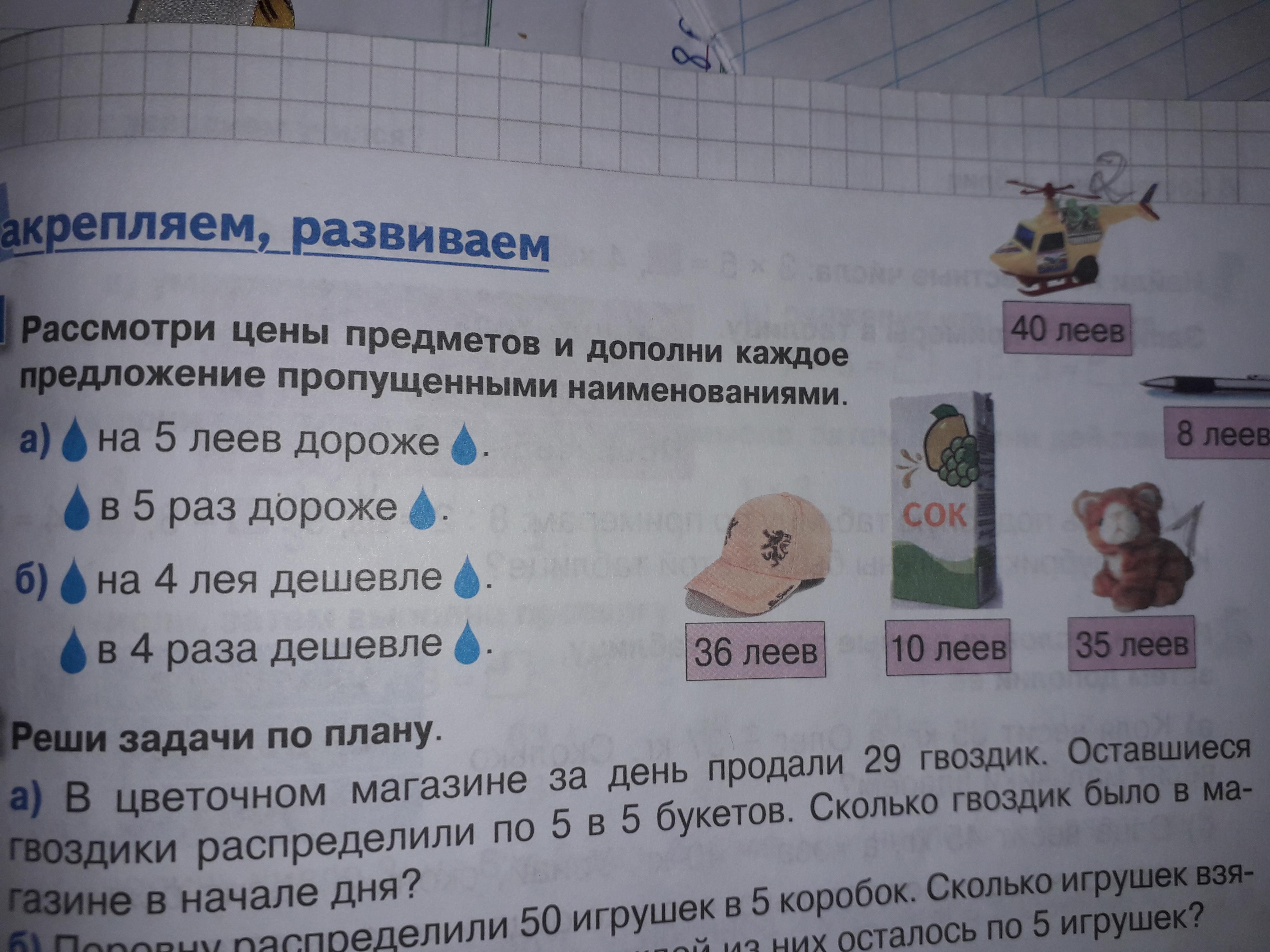 Ответ: а) вертолёт на пять леев дороже игрушечного тигрёнка. (40-35=5 леев.)