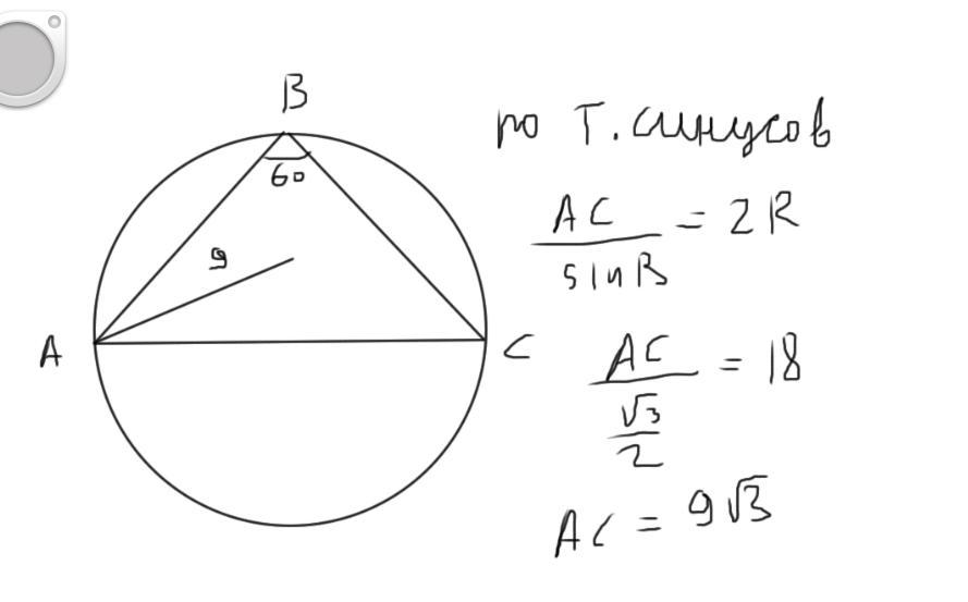 В треугольнике ABC AC = ?, а угол против него 60°. Радиус писаной окружности R = 9 см. Найти сторону AC.