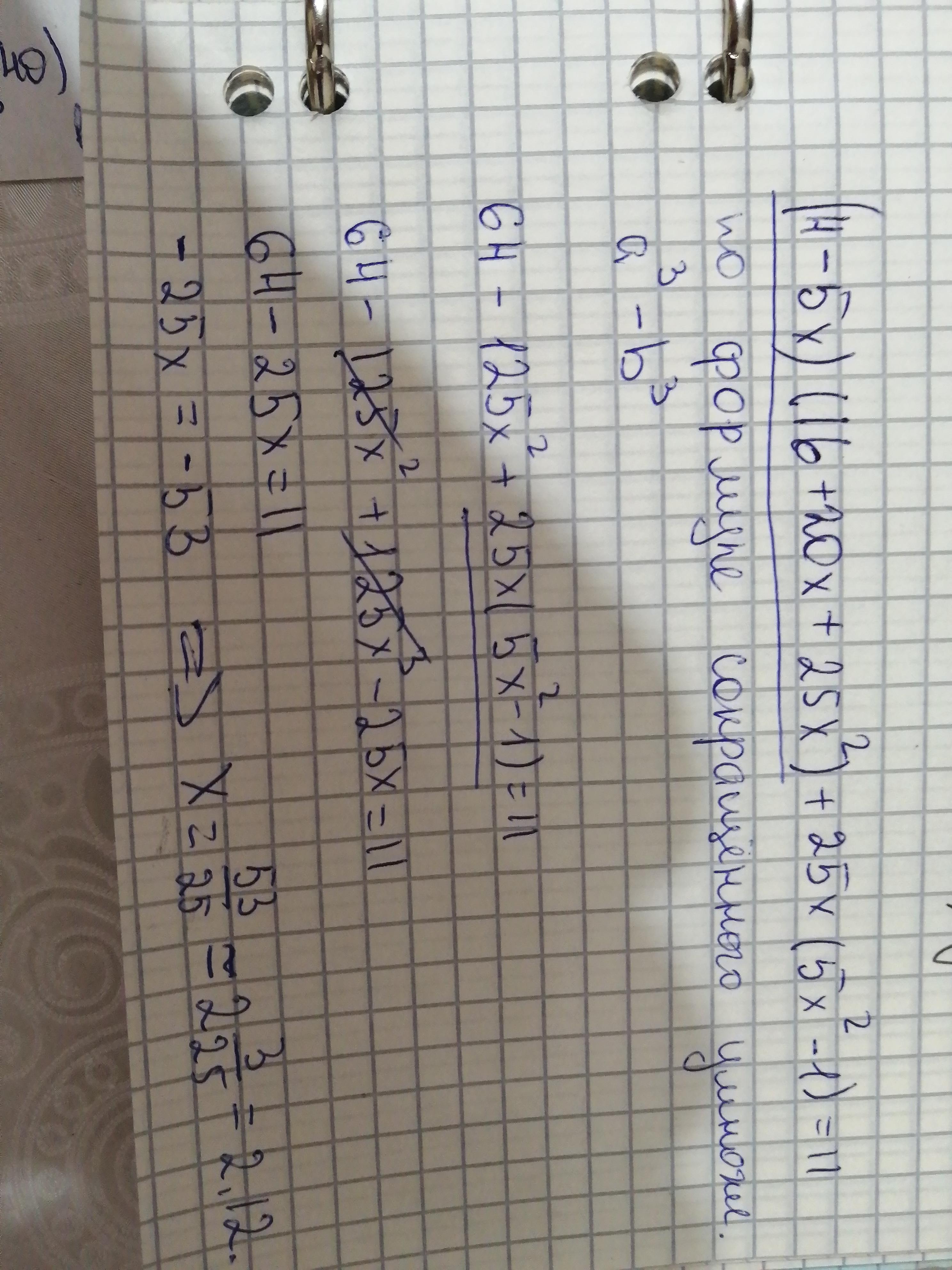 Помогите сделать уравнение плисс (4-5x)(16+20x+25x2)+25x(5x2-1)= 11
