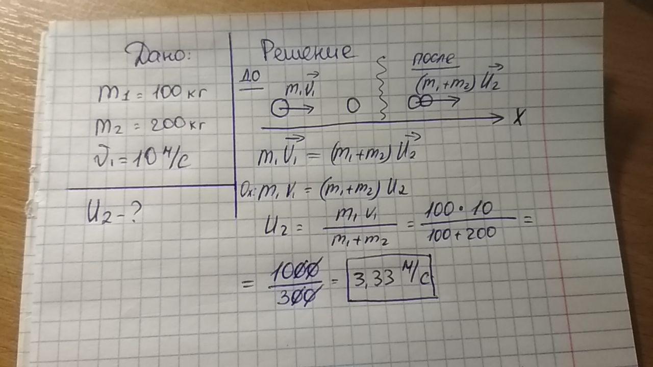Вагон массой 100кг врезался в неподвижный вагон массой 200кг. С какой скоростью вагоны едут, первый вагон врезался со скоростью 1м в с
