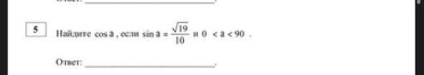 cosa=±√1²-(√19/10)²=±√1-19/100=±√(100-19)/100=±√81/100=9/10=0,9