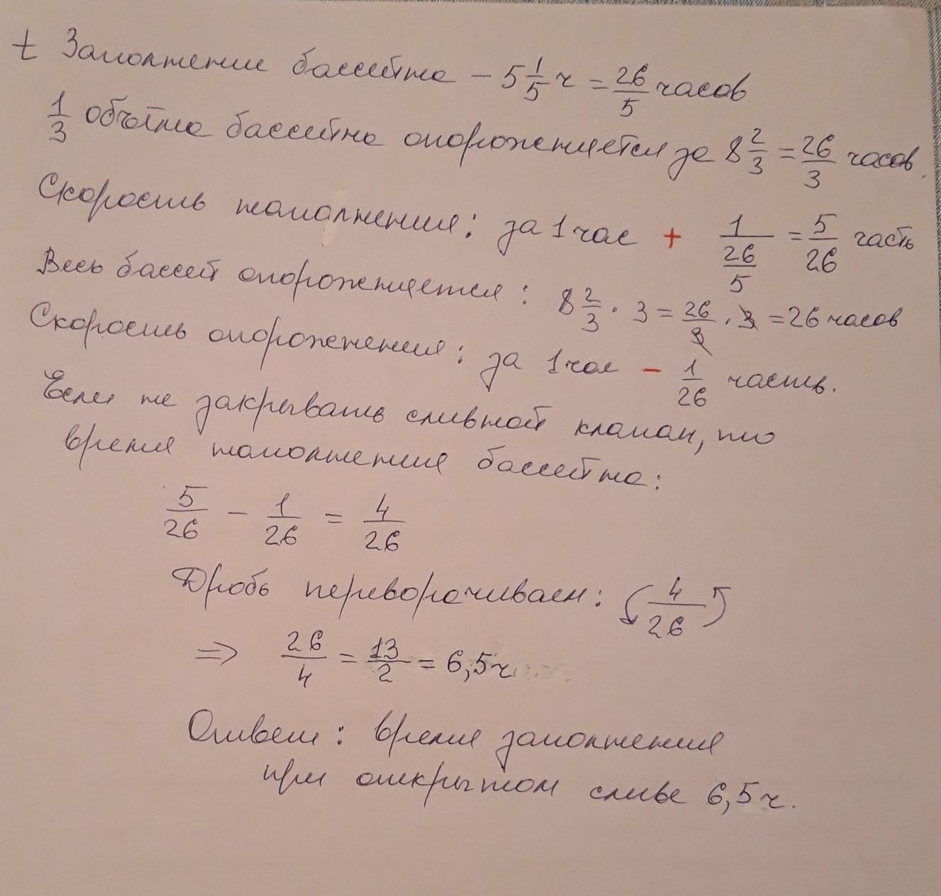 басейн можно наполнить за 26/5 часа, а спустить через сливное отверстие объем 1/3 басейна за 26/3 часа. сколько времени нужно для наполнения басейна, если не закрывать слив?