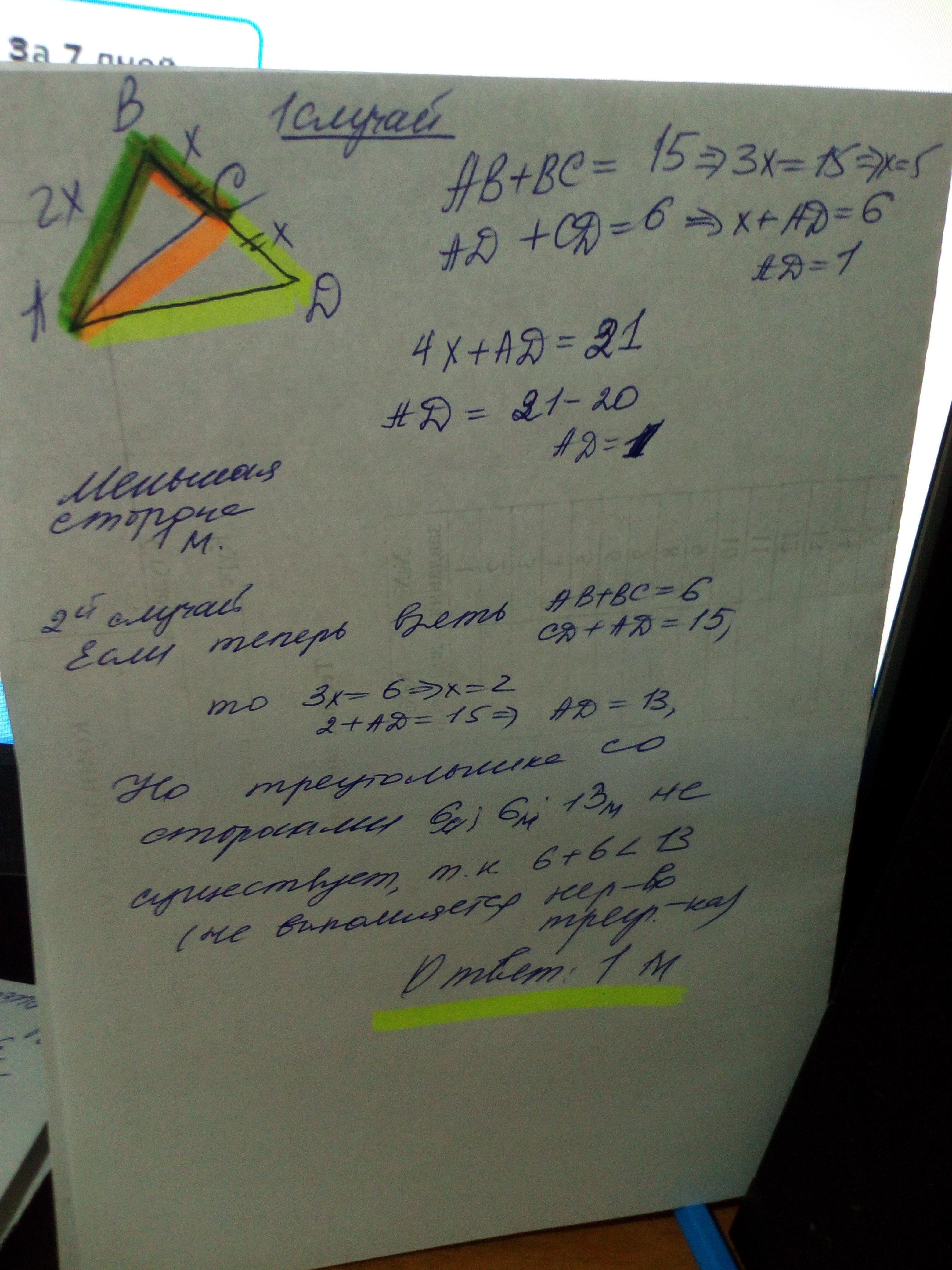 .Медіана, проведена до однієї з бічних сторін рівнобедреного трикутника, ділить його периметр на дві частини довжинами 15 м і 6 м. Знайдіть сторони трикутника. У відповідь запишіть довжину меншої сторони (у м).