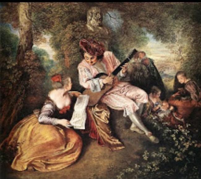 Какой музыкальный инструмент изображён на картине Жанна Антуана Ватто "Гамма любви"?
