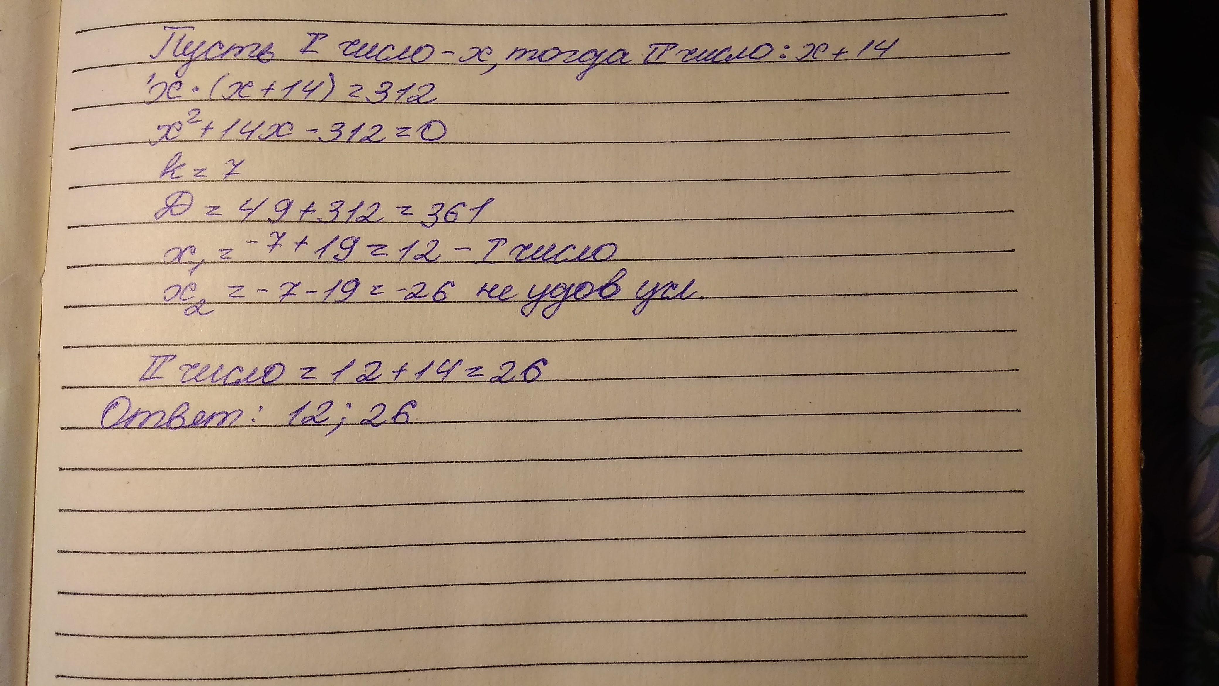 найдите два положительных числа одно из которых на 14 больше другого а их произведение равно 312