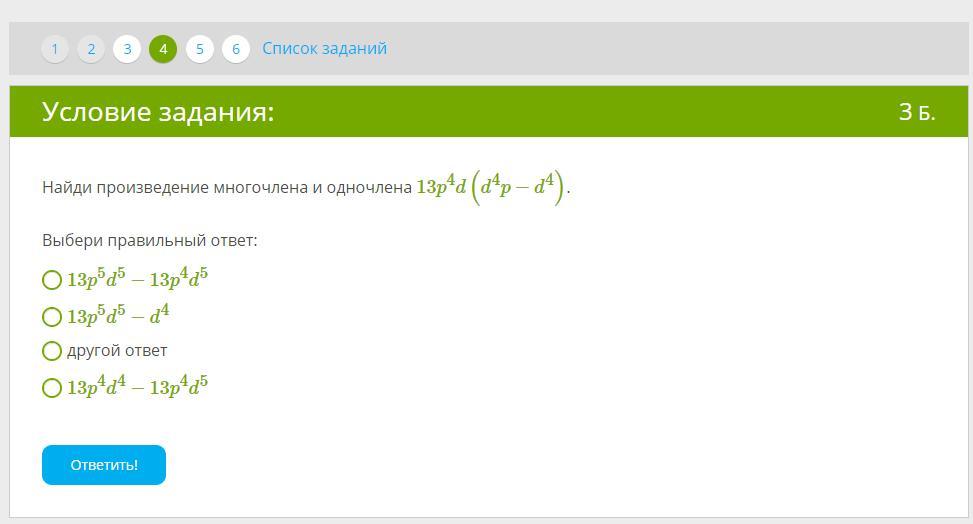Найди произведение многочлена и одночлена 13p4d(d4p−d4) .. Выбери правильный ответ: