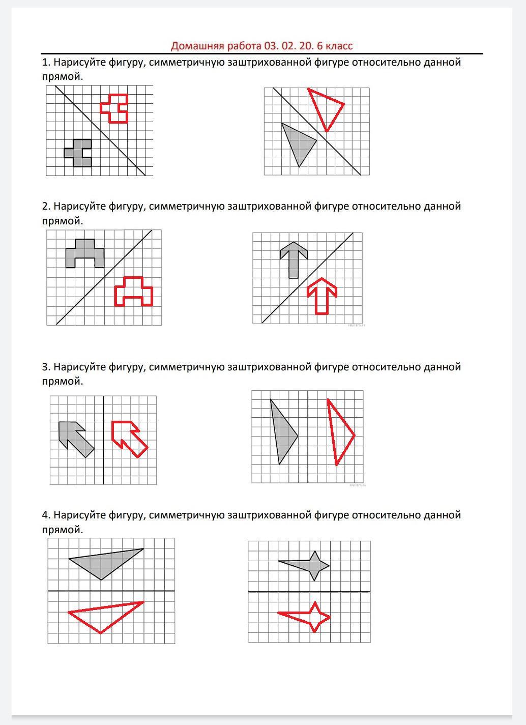 Домашняя работа 03.02.20 6 класса изображена во вложении. Прошу прощения за небольшие неровности в чертеже. Сообщите, пожалуйста, если есть недочёты.