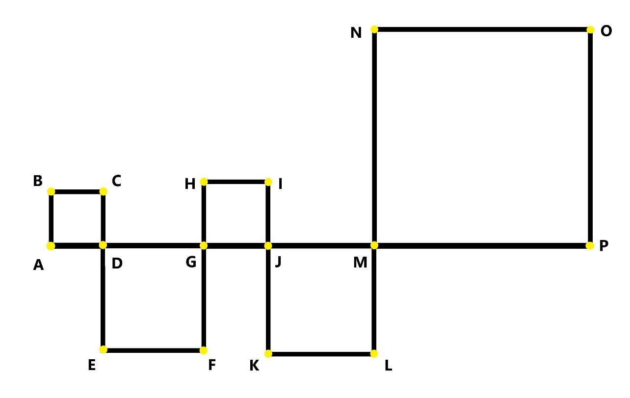 Максимальная скорость курьера 60 км/ч. Расстояние от склада до дома курьера по прямой равно 30 км. Известно, что ABCD, DEFG, GHIJ, JKLM, MNOP – квадраты, и KL = 2HI, EF = 2BC, EF + KL = NO, HI больше, чем ВС, на 2 км. Считайте, что повороты курьер совершает мгновенно. На вручение клиенту одной посылки курьер тратит 5 минут.