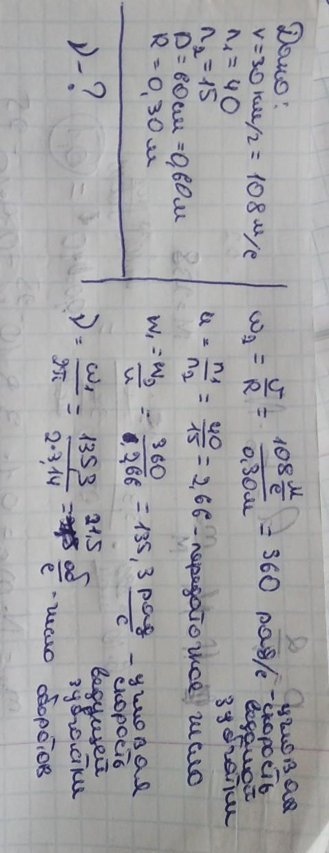 Как быстро (т. е. сколько оборотов в секунду) надо вращать педали велосипеда, чтобы ехать со скоростью 30 км/ч, если известно, что ведущая зубчатка имеет 40 зубцов, ведомая 15, и диаметр колес велосипеда равен 60 см? Ответ округлите до десятых.
