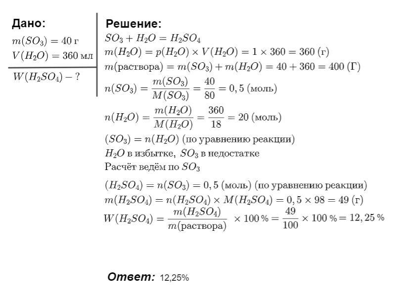 Серный ангидрид количеством 40г растворили в 360мл воды. Рассчитайте массовую долю получившейся кислоты в растворе. ЧЕРЕЗ УРАВНЕНИЕ РЕАКЦИИ ПЖ