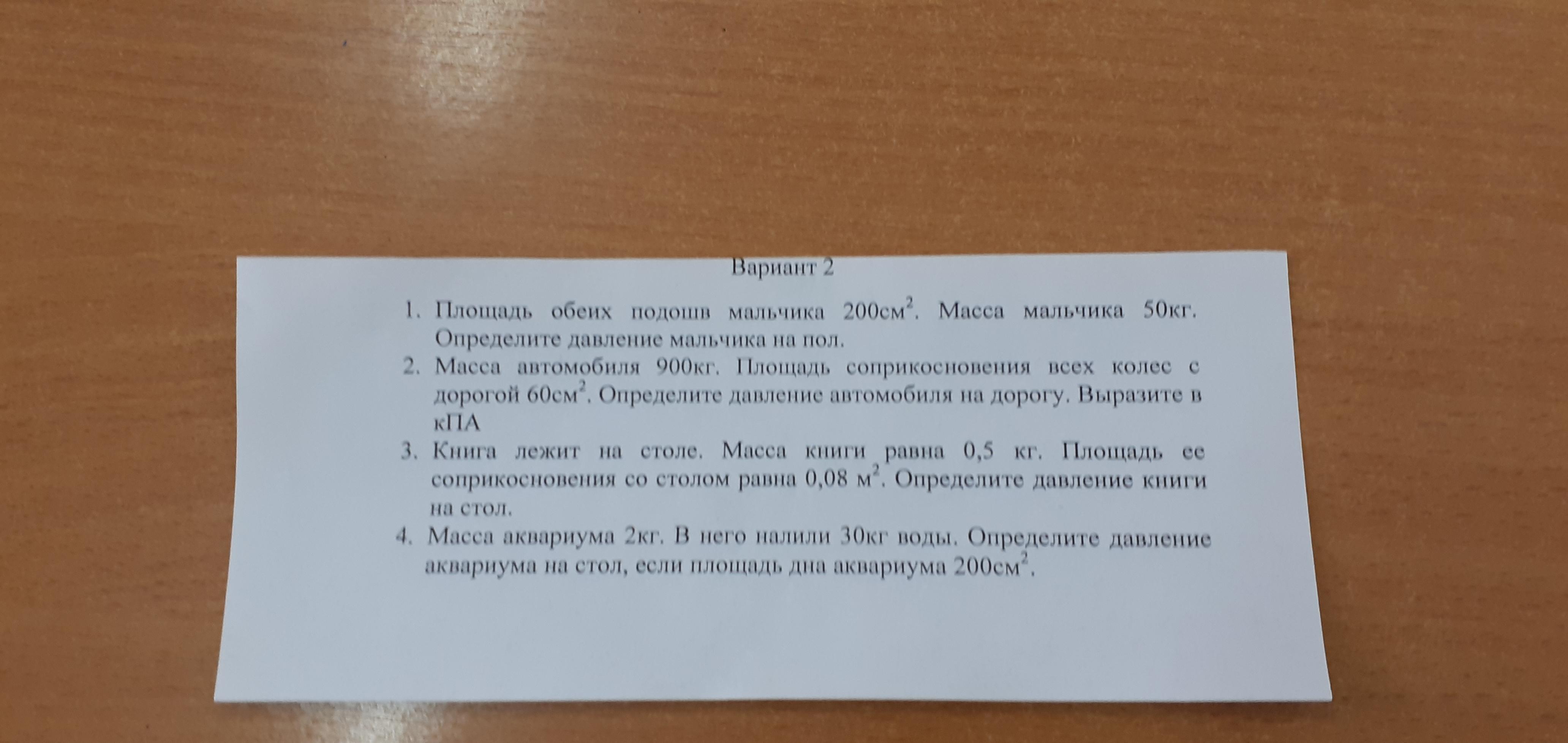 4.p = f/s = mg/s = (2 + 30)*10/0.02 = 16000па или 16 кпа
