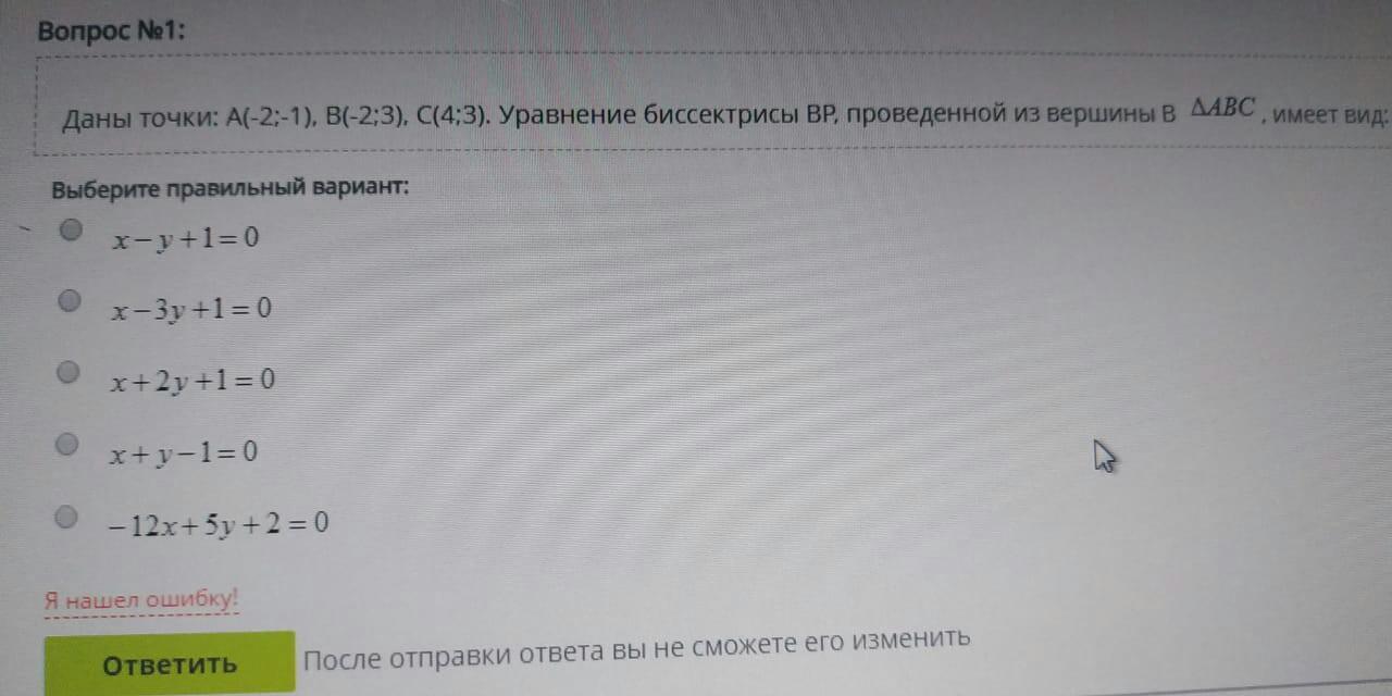 Ответ: уравнение биссектрисы х + у - 1 = 0.
