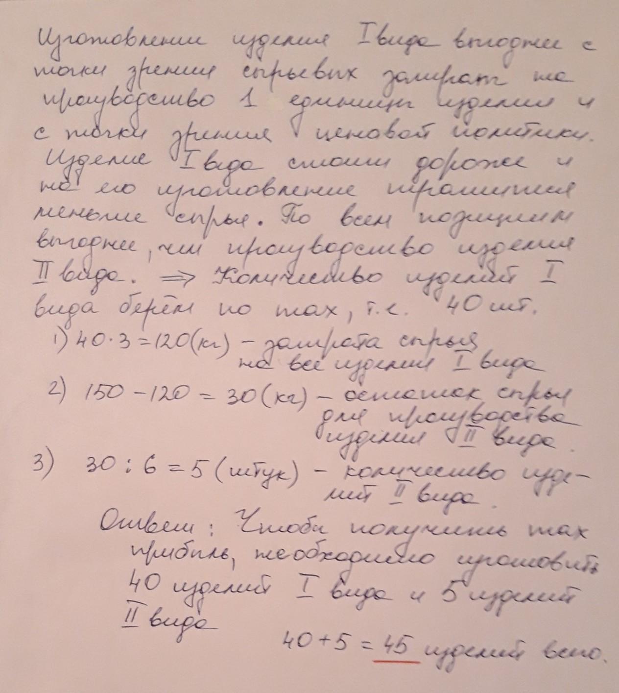 Для изготовления изделий двух видов имеется 150 кг сырья. На изготовление одного изделия 1 вида расходуется 3 кг сырья, а изделие 2 вида- 6 кг. При этом изделий 1 вида требуется изготовить не более 40, а изделий 2 вида – не более 30. Сколько нужно произвести изделий каждого вида чтобы получить наибольшую прибыль от продажи изделий, если отпускная стоимость одного изделия 1 вида составляет 3 ден.ед.. а изделия 2 вида- 2 ден.ед? В ответе указать сумму числа изделий.