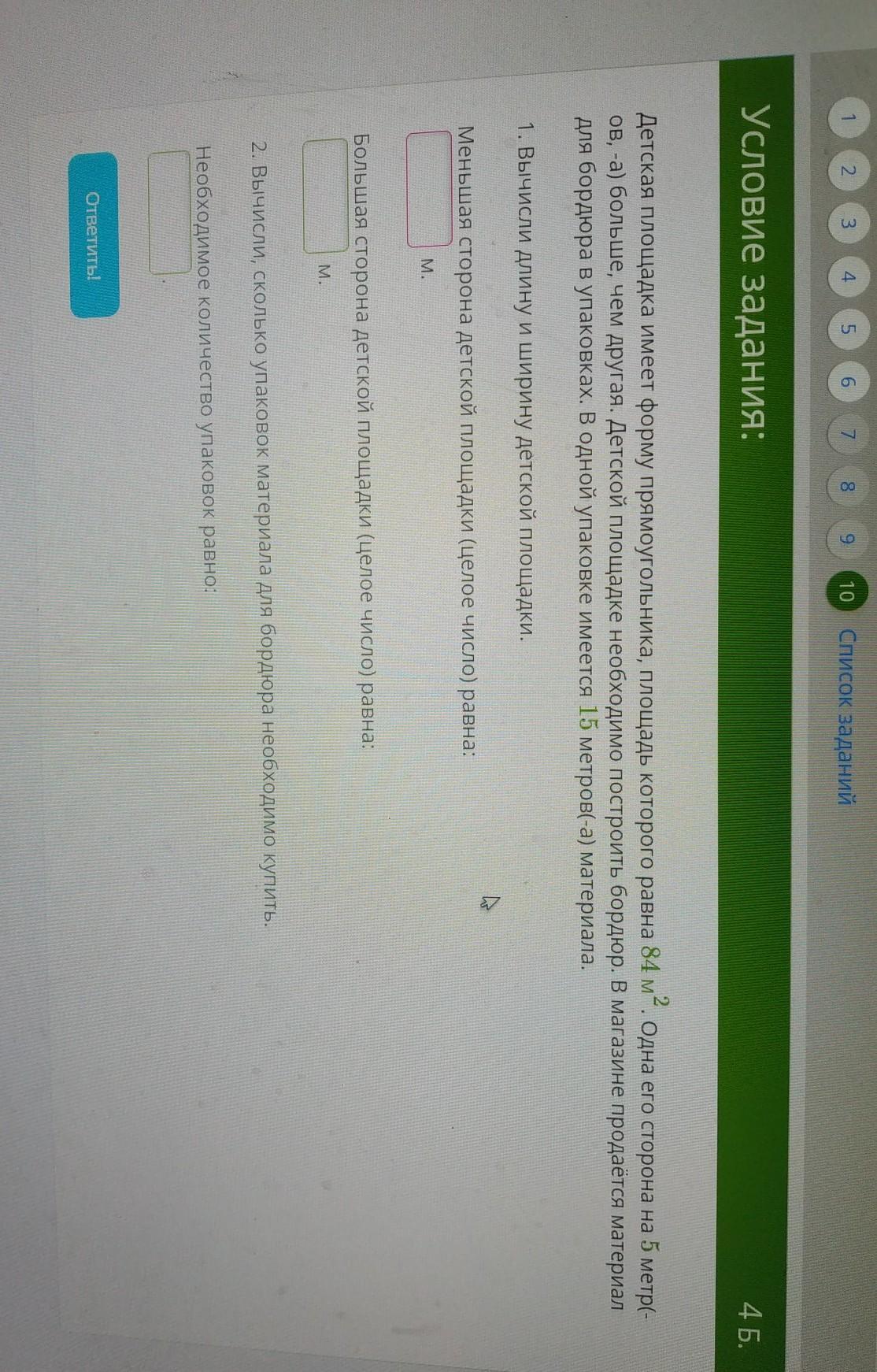 детская площадка имеет форму прямоугольника , площадь которого равна 84 м2