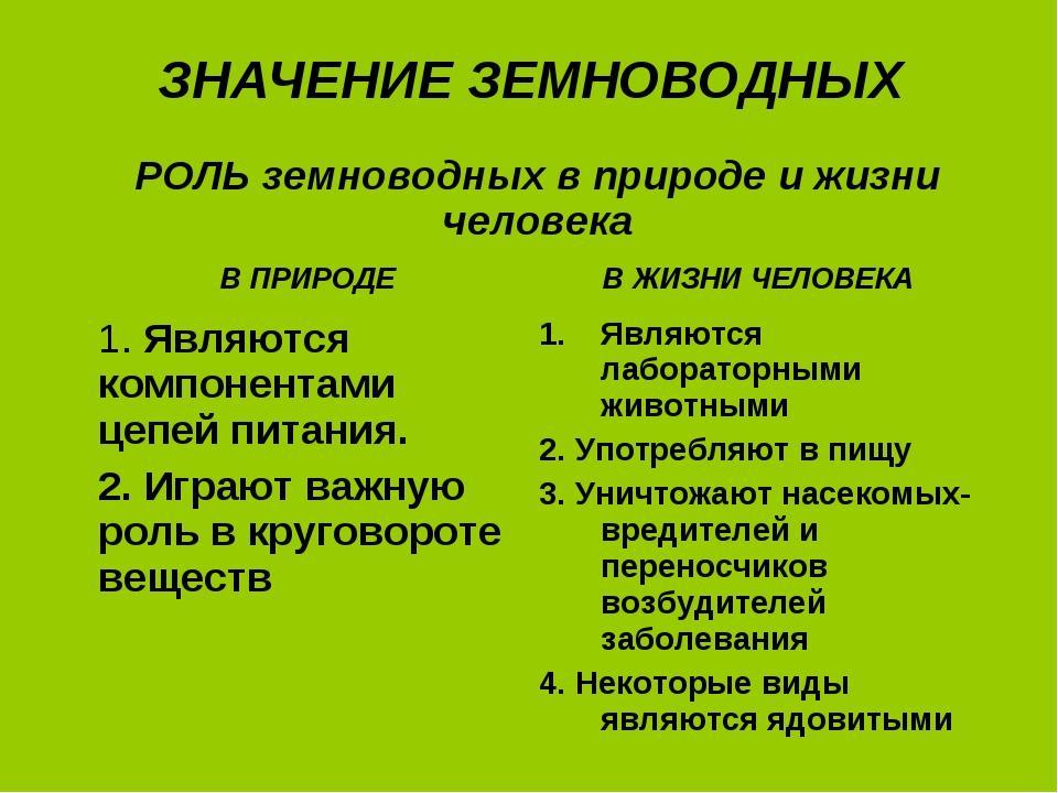 Роль земноводных в природе и жизни человека Земноводными питаются разные животные, и сами они уничтожают многих беспозвоночных, контролируя численность кровососущих насекомых и насекомых, вредящих культурным растениям. ... Земноводные имеют важное хозяйственное значение: мясо отдельных видов человек употребляет в пищу.