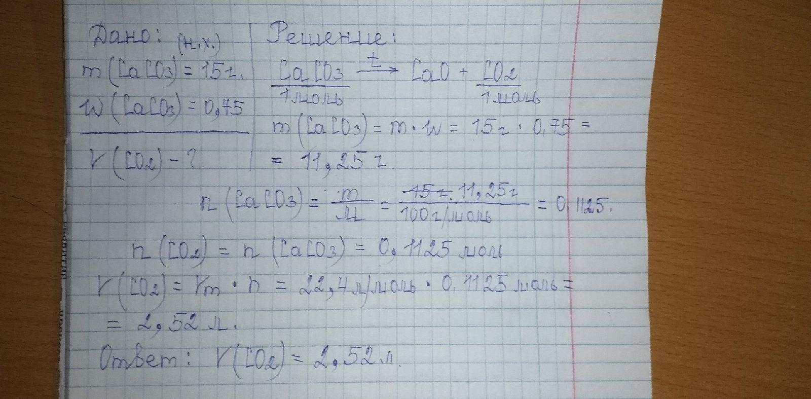 Вычислить объем углекислого газа, который выделится при термическом разложении куска мела массой 15 г с содержанием карбоната кальция 75%.