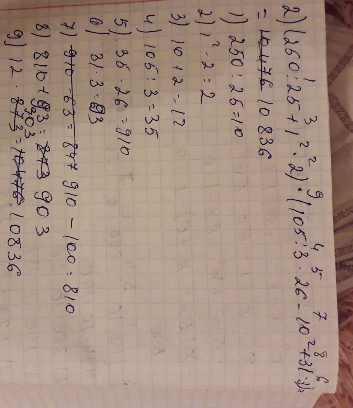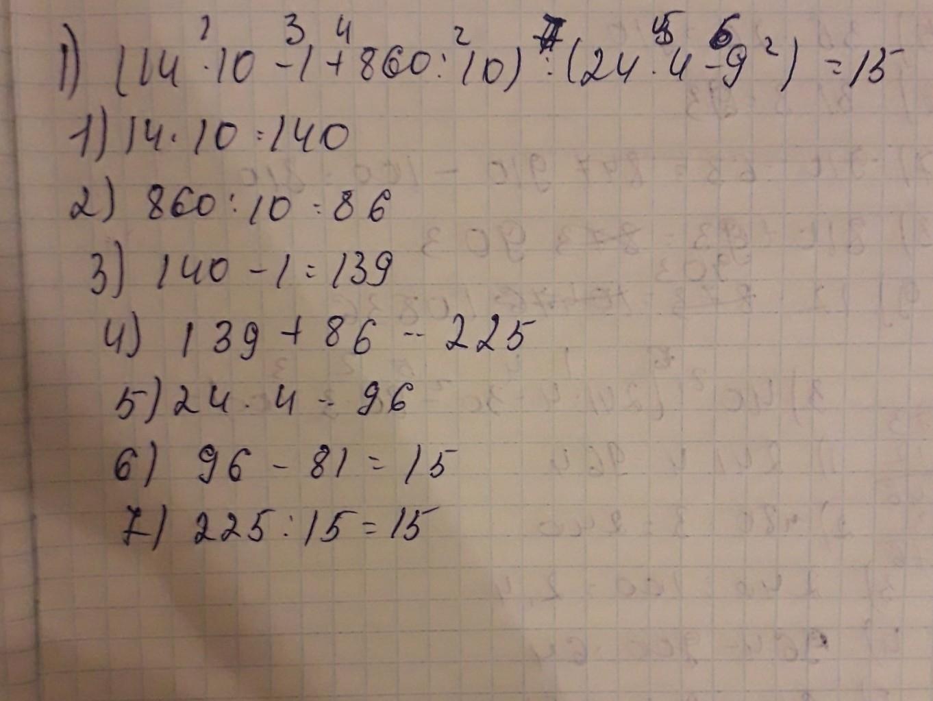 (14•10-1+860÷10)÷(24•4-9²)=(140-1+86)÷(96-81)=225÷15=15 (250÷25+1²•2)•(105÷3•26-10²+31•3)=(10+2)•(35•26-100+93)=12•903=10836 40²÷(241•4-30²-80•30÷100)=1600÷(964-900-2400÷100)=1600÷40=40