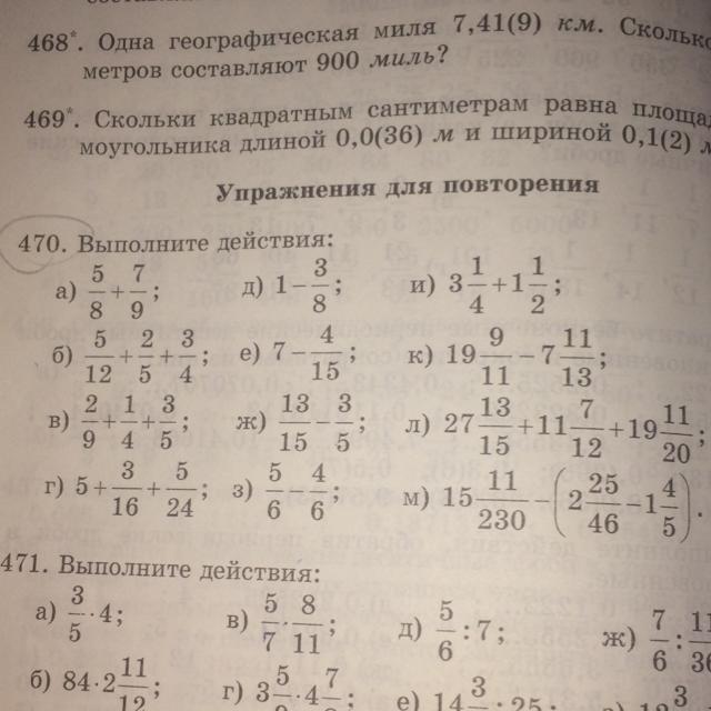 a)5/8+7/9= 45/72+56/72=101/72=1.29/72 б)5/12+2/5+3/4=25/60+24/60+45/60=94/60=1.34/60в)2/9+1/4+3/5=40/180+45/180+108/180=193/180= 1. 13/180 г)5+3/16+5/24=5+9/48+10/48=5.19/48 д)1-3/8=8/8-3/8=5/8 е)7-4/15=6.11/15ж)13/15-3/5=13/15-9/15=4/15 з)5/6-4/6=1/6 и)3.1/4+1.1/2=4.3/4