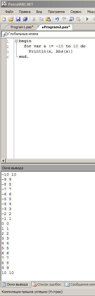 б) Составьте программу, выводящую на экран все числа от - 10 до 10,а также их модули