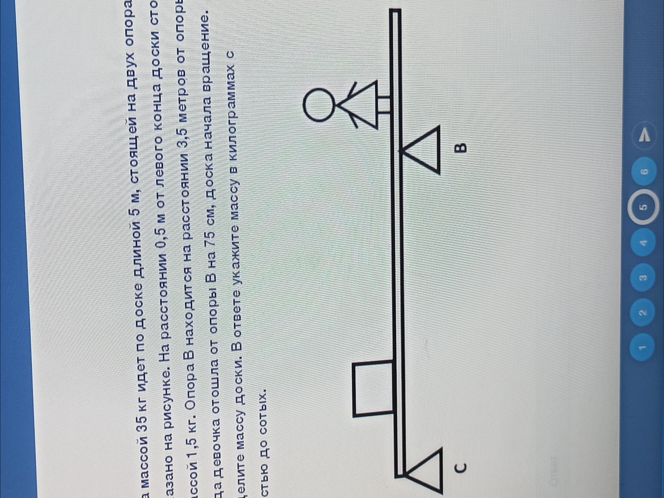 Девочка массой 35 кг идет по доске длиной 5 м, стоящей на двух опорах, как показано на рисунке. На расстоянии 0,5 м от левого конца доски стоит груз массой 1,5 кг. Опора В находится на расстоянии 3,5 м от опоры С. Когда девочка отошла от опоры В на 75 см, доска начала вращение. Определите массу доски