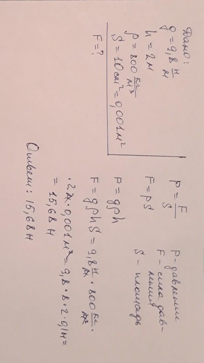 В баке, наполненном доверху керосином, имеется боковое отверстие площадью 10 кв.см. центр которого находится на расстоянии 2м от поверхности жидкости. Определить силу давления на пробку, закрывающую отверстие.
