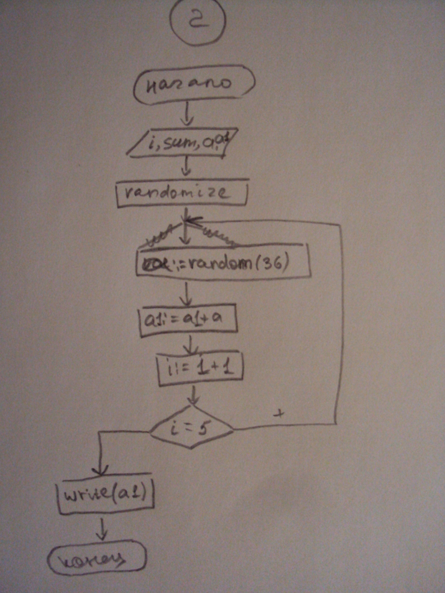 Задание 2) Разработать блок схему алгоритма? для вычисления и вывода на экран суммы 5 случайных числе в диапазоне 0..36.