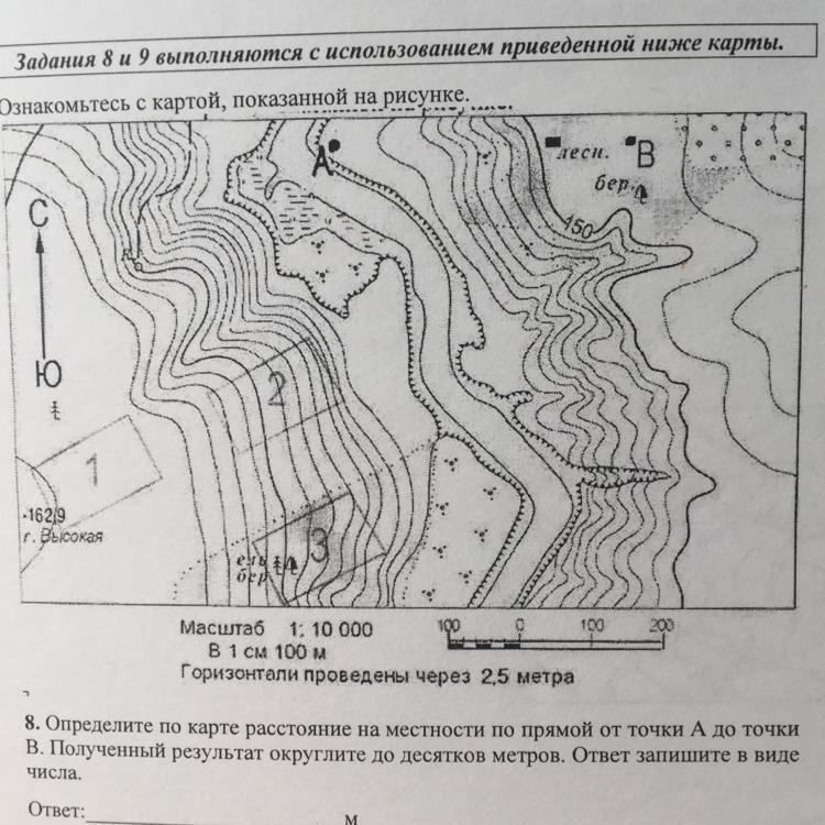 1.Определите по карте расстреляете на местности по прямой от точки А до точки В.Полученный результат округлите до десятков метров.Ответ запишите в виде числа.