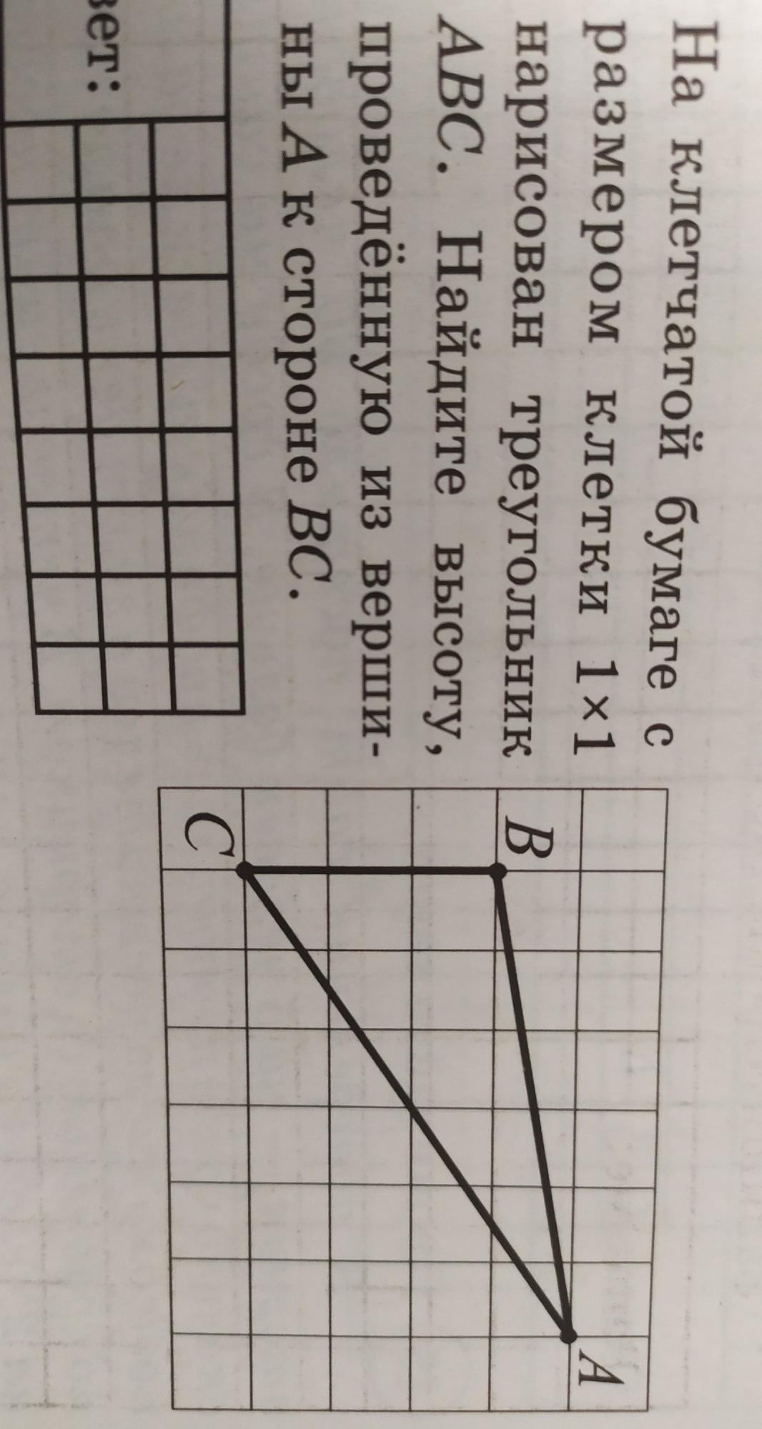 Помогите, пожалуйста. На клетчатки бумаге с размером клетки 1на1 нарисован треугольник АВС. Найдите высоту, проведённую из вершины А к стороне ВС.