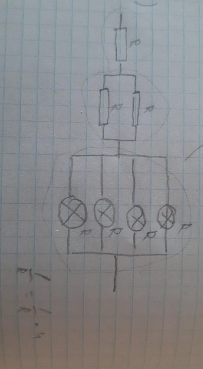 Ответ: для двух параллельных резисторов сопротивление равно 0,5*R, для 4 параллельных имеем 0,25*R. Суммарное сопротивление R+0,5*R+0,25*R=1,75*R.