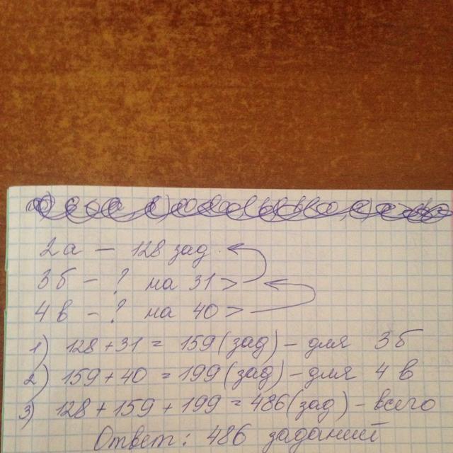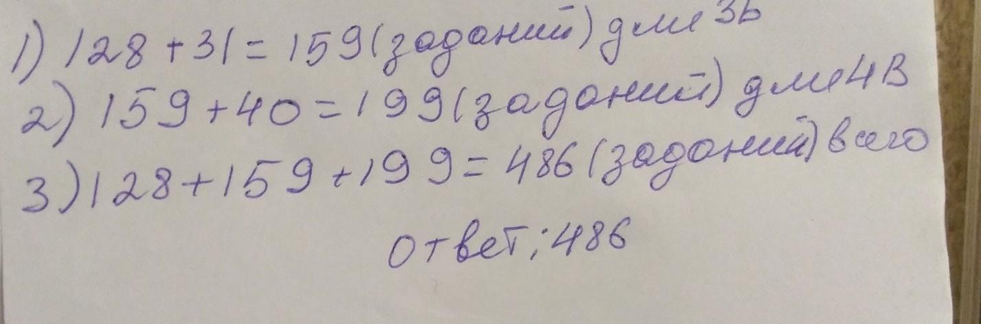 В начале каждого месяца для своих учеников вы готовите задания из «ЯУ». Для 2 «А» класса вы подобрали 128 заданий, что на 31 меньше чем для 3 «Б». Для 4 «В» класса вы подготовили на 40 заданий больше, чем для 3 «Б». Сколько всего заданий было подготовлено?