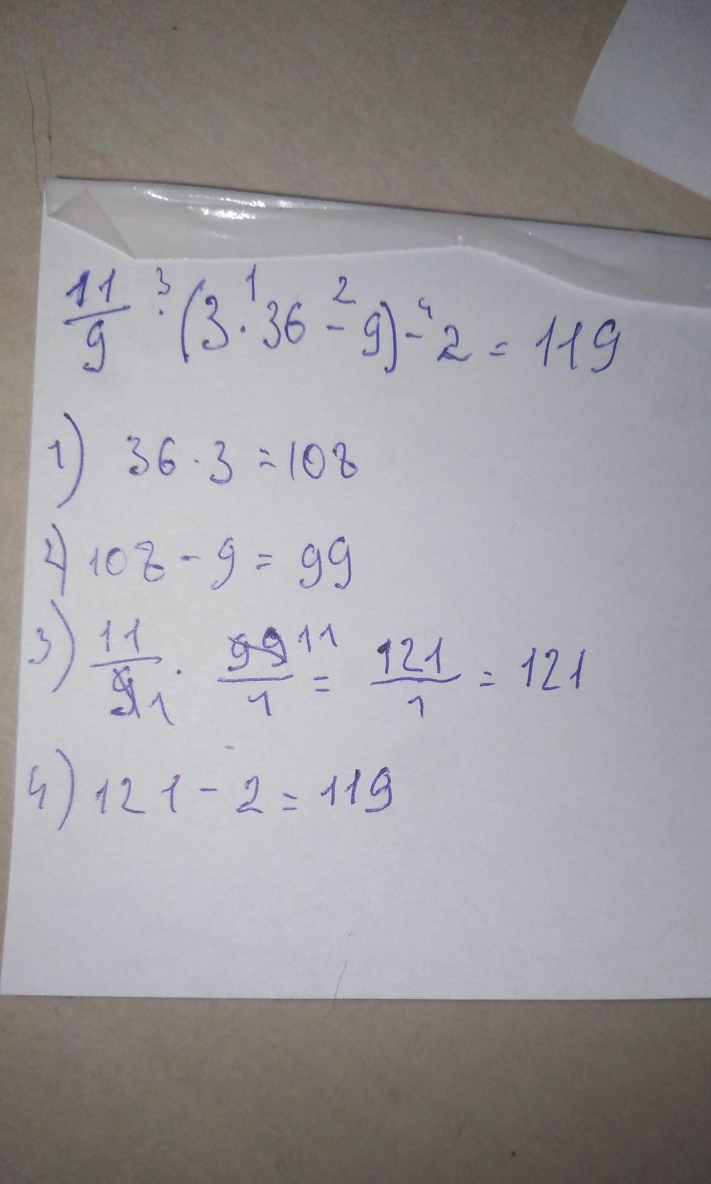 2 первых действия так-же, а 3 действие. 1 целая 1/9*99/1=10/9*99/1=10/1*11/1=110. 4 действие. 110-2=108