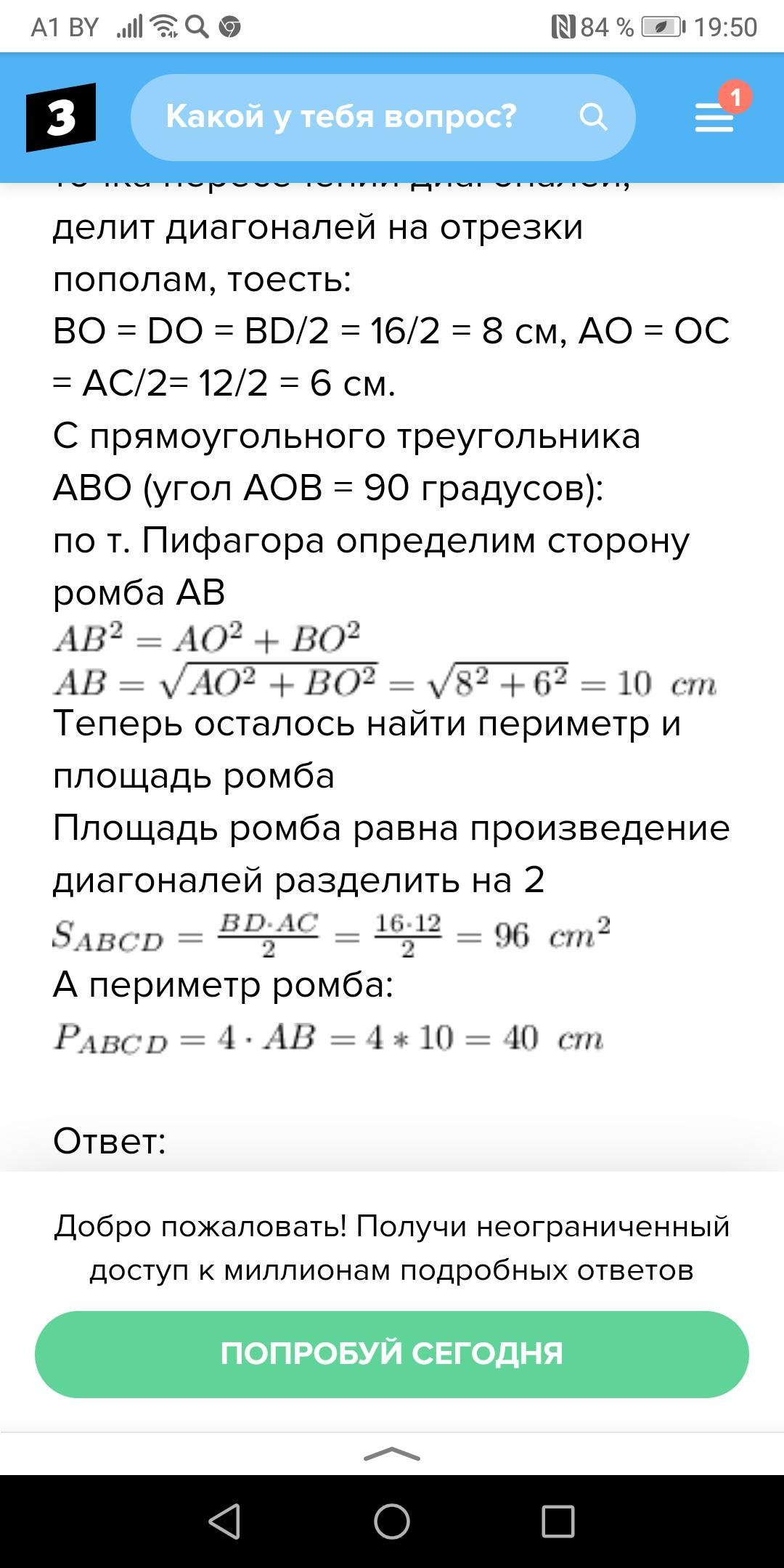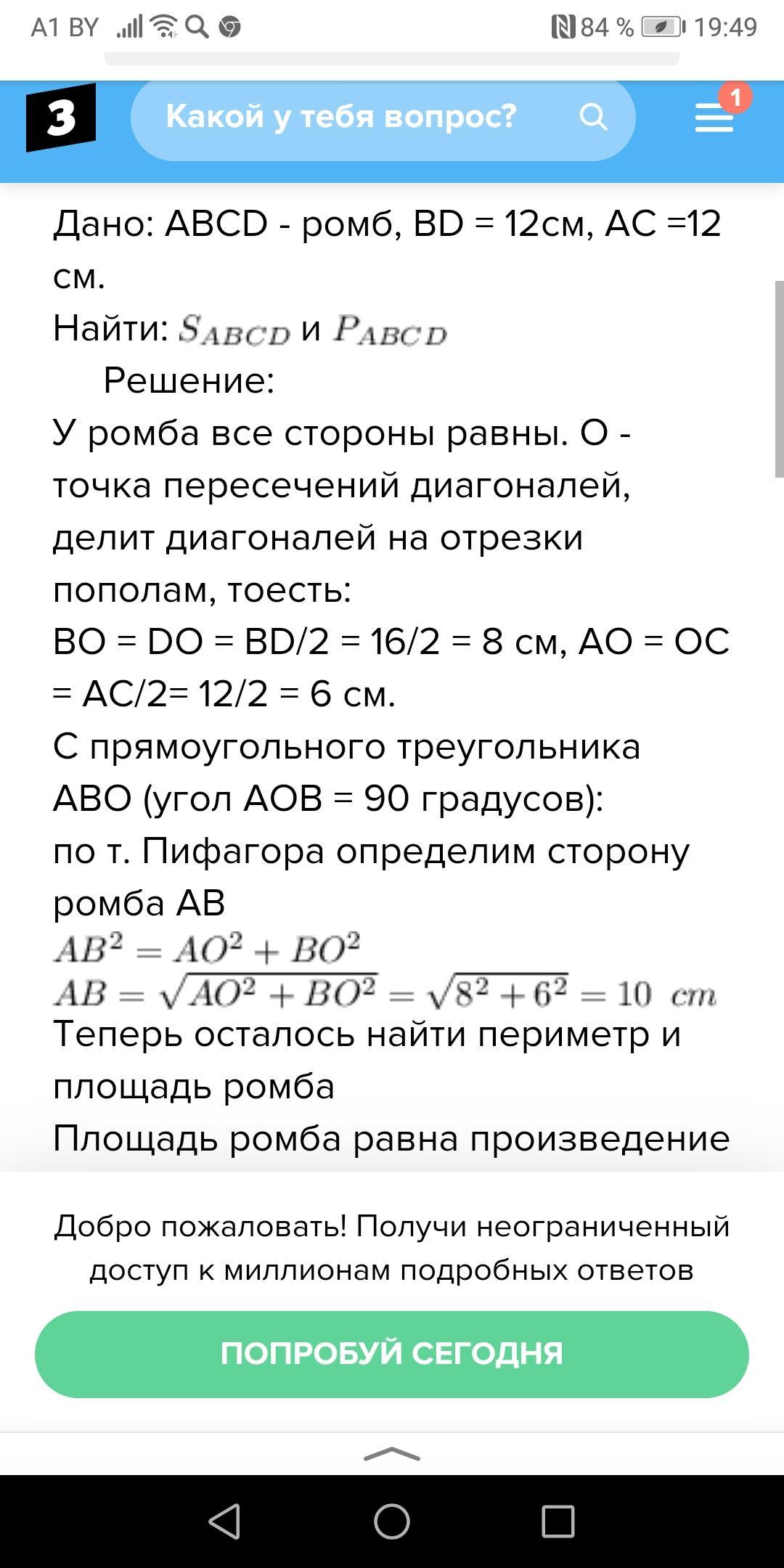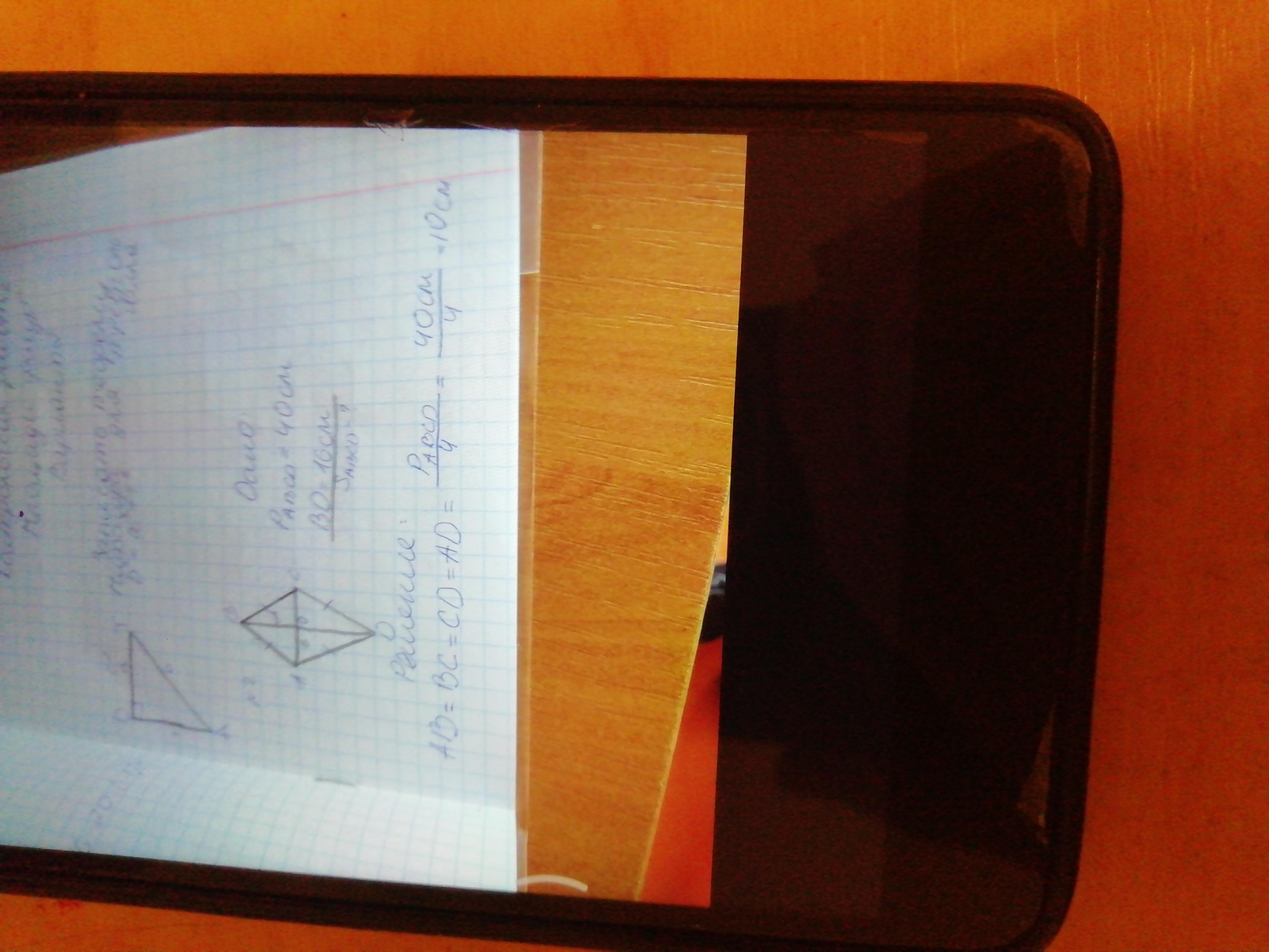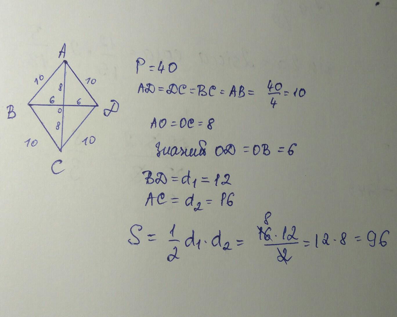 Дан ромб Pромба = 40 см. BD (диагональ, из там две) равна 16 см. Найти площадь ABCD. И можете помочь пожалуйста нам математичка давала площадь ромба =D1 х D2/2 и после х 4. Во всех других источниках написано без умножения на четвёрку что делать. Первые две фотографии решены по том как нам давала математичка. А вторые две как дано в интернете