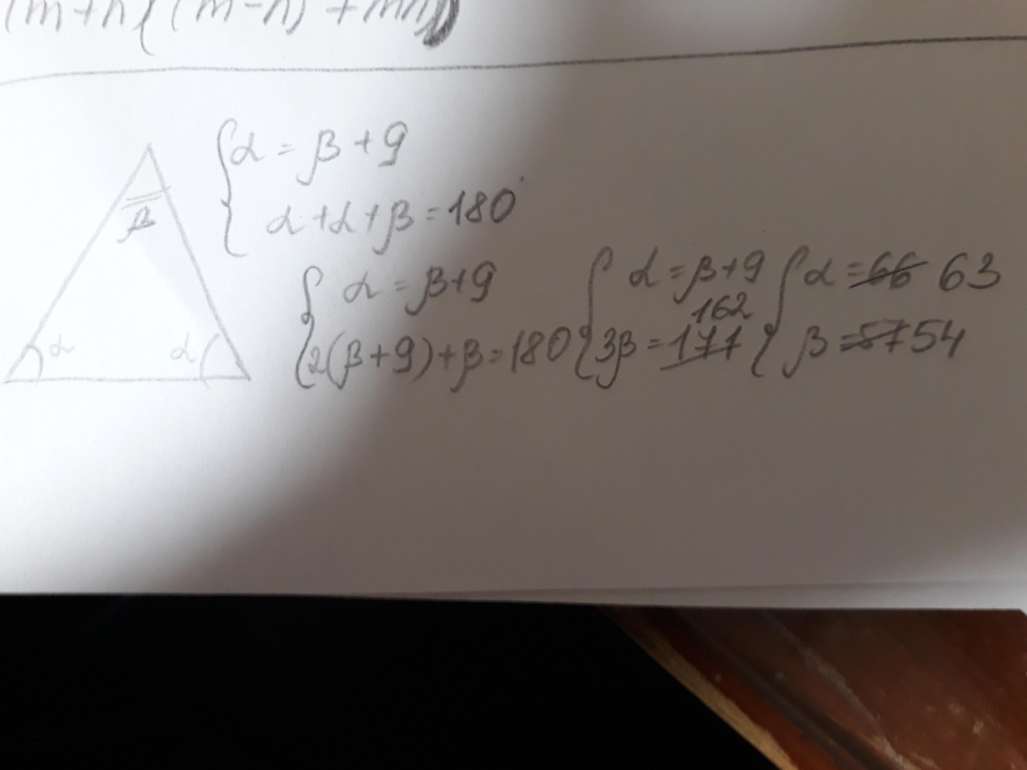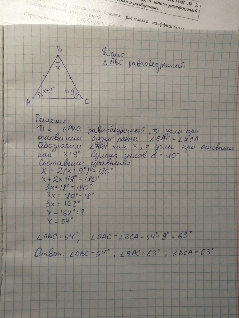 Градусная мера угла при основании равнобедренного треугольника на 9° больше градусной меры угла при его вершине. Найдите градусные меры всех углов треугольника