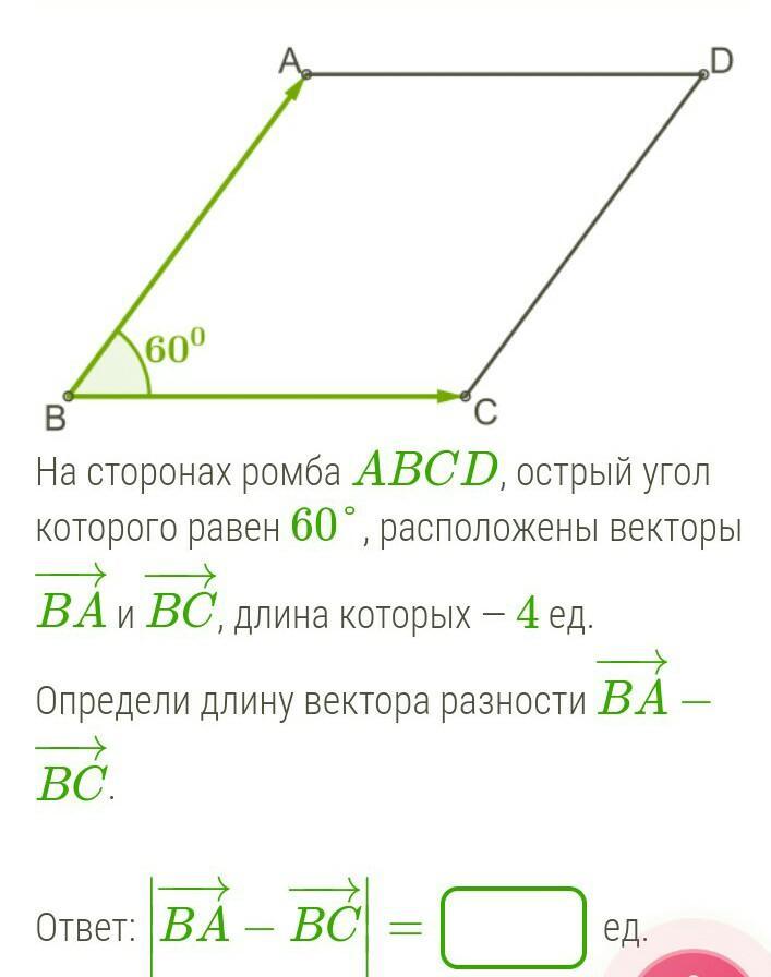 Разностью данных векторов является вектор ас, а т.к. угол В=60°, следовательно треугольник авс - равносторонний по правилу параллелограмма, откуда следует, что AC =4 ед.