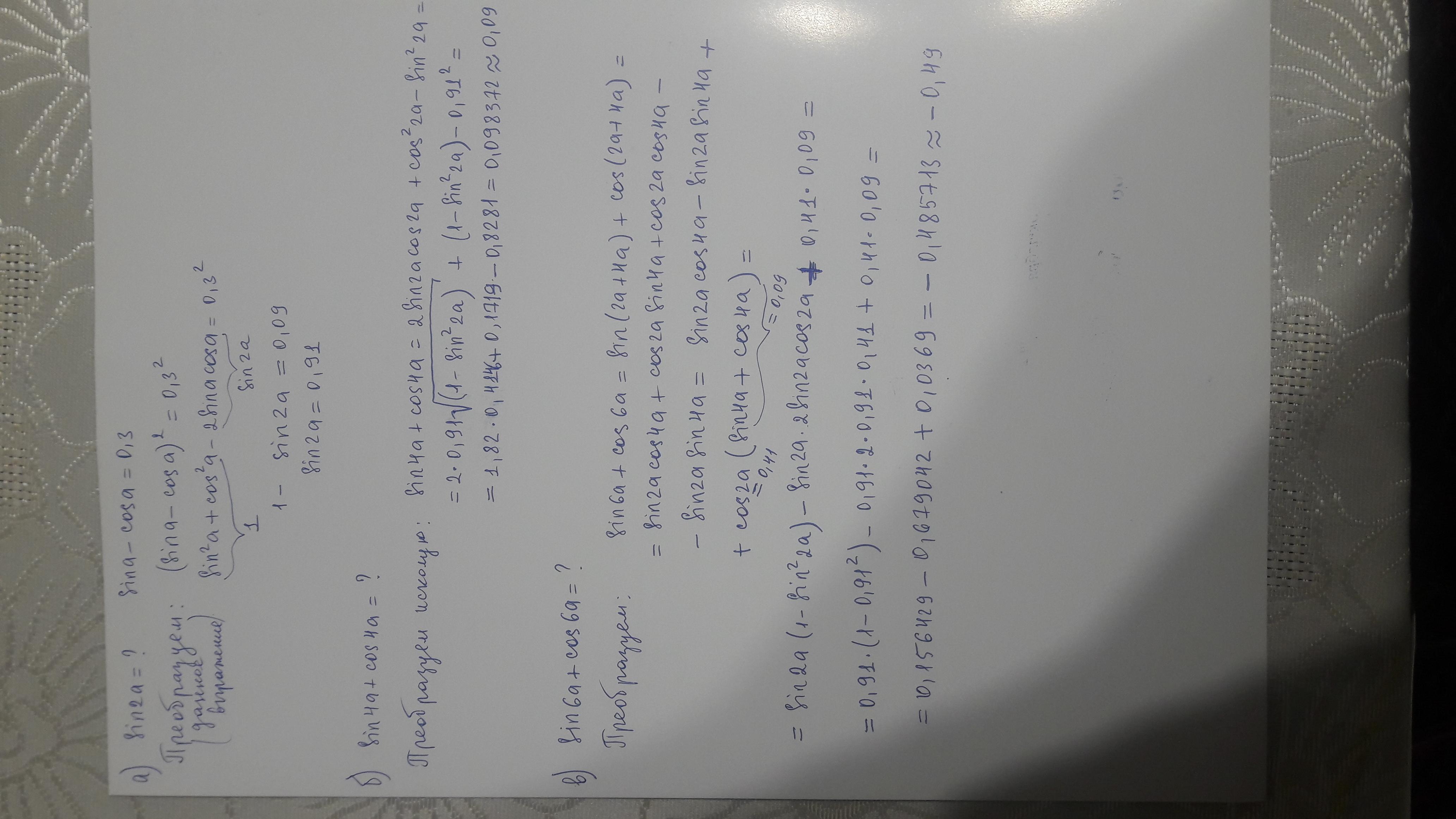 Старалась быть внимательней, если будут ошибки заранее извиняюсь. Что-то сложные вычисления получилось. Применены только основные тригоном.формулы.