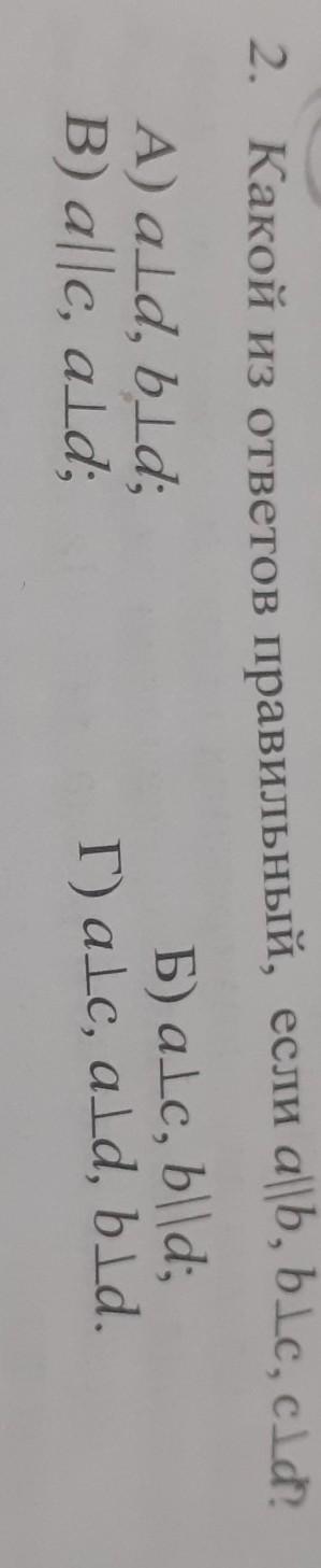 Очень важно в таких задачах пространственное мышление. Обо все по порядку. Т.к по условию а║b и b ⊥ c, значит, a ⊥ c. Т.к c ⊥ d, значит a║b║d. Для большего понимая лучше нарисовать рисунок и увидеть это самому (все условия совпадают с Б, поэтому этот вариант ответа верный)