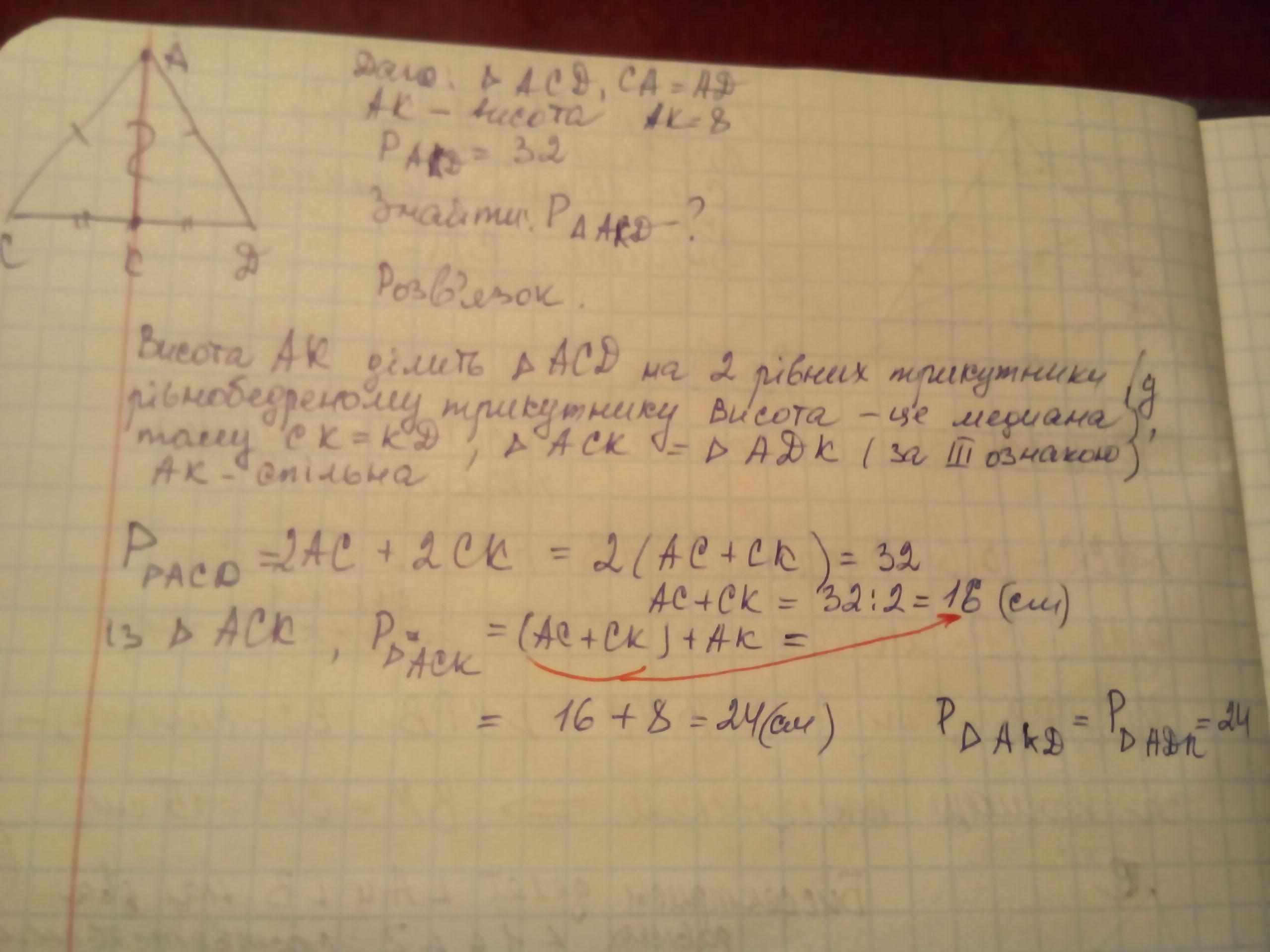 У рівнобедреному трикутнику acd з основою cd проведено висоту ак. знайдіть периметр трикутника акd, якщо ак=8 см, а периметр трикутника асd=32 см