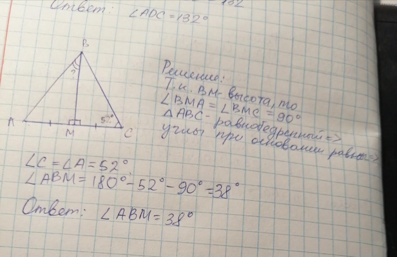 Сумма углов равна 180° ⇒ А + В + С = 52 + В + 52 = 180