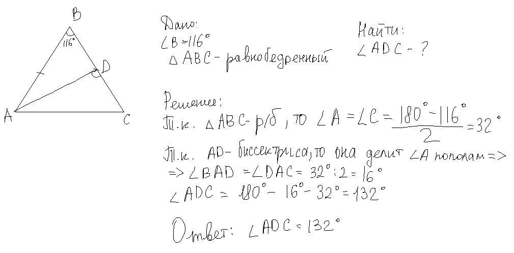 в равнобедренном треугольнике ABC, с основанием AC проведена биссектриса AD. найдите угол ADC, если угол B = 116°