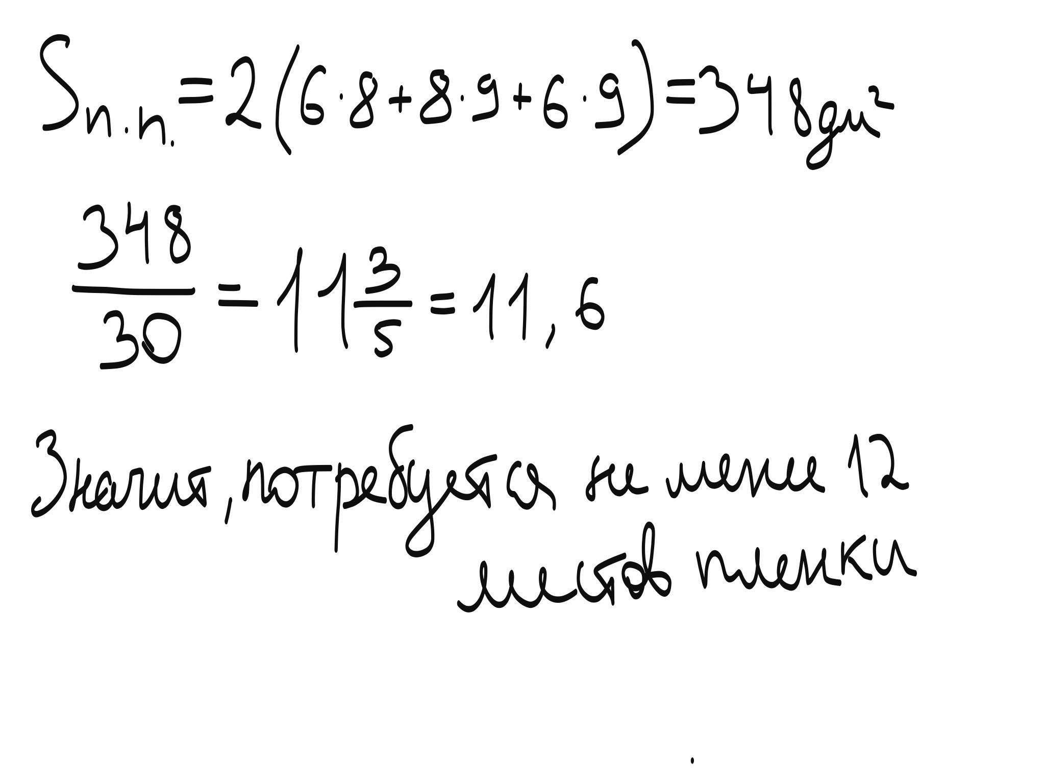 Пластиковый контейнер в форме прямоугольного параллелепипеда, высота которого 6 дм, ширина 8 дм, а длина 9 дм, решили обклеить самоклеящейся плёнкой. Сколько листов плёнки потребуется, если площадь одного листа плёнки равна 30 дм2?