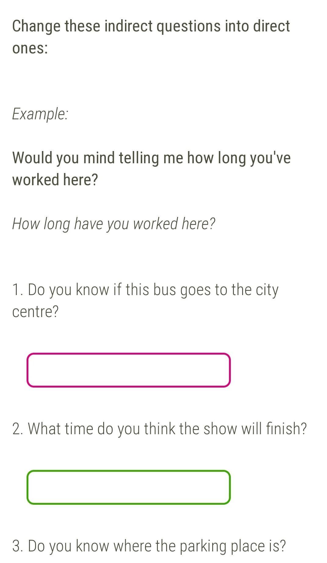 1. Знаете ли вы, если этот автобус идет в центр? 2. Как вы думаете, в какое время шоу закончится? 3. Знаете ли вы, где находится автостоянка?