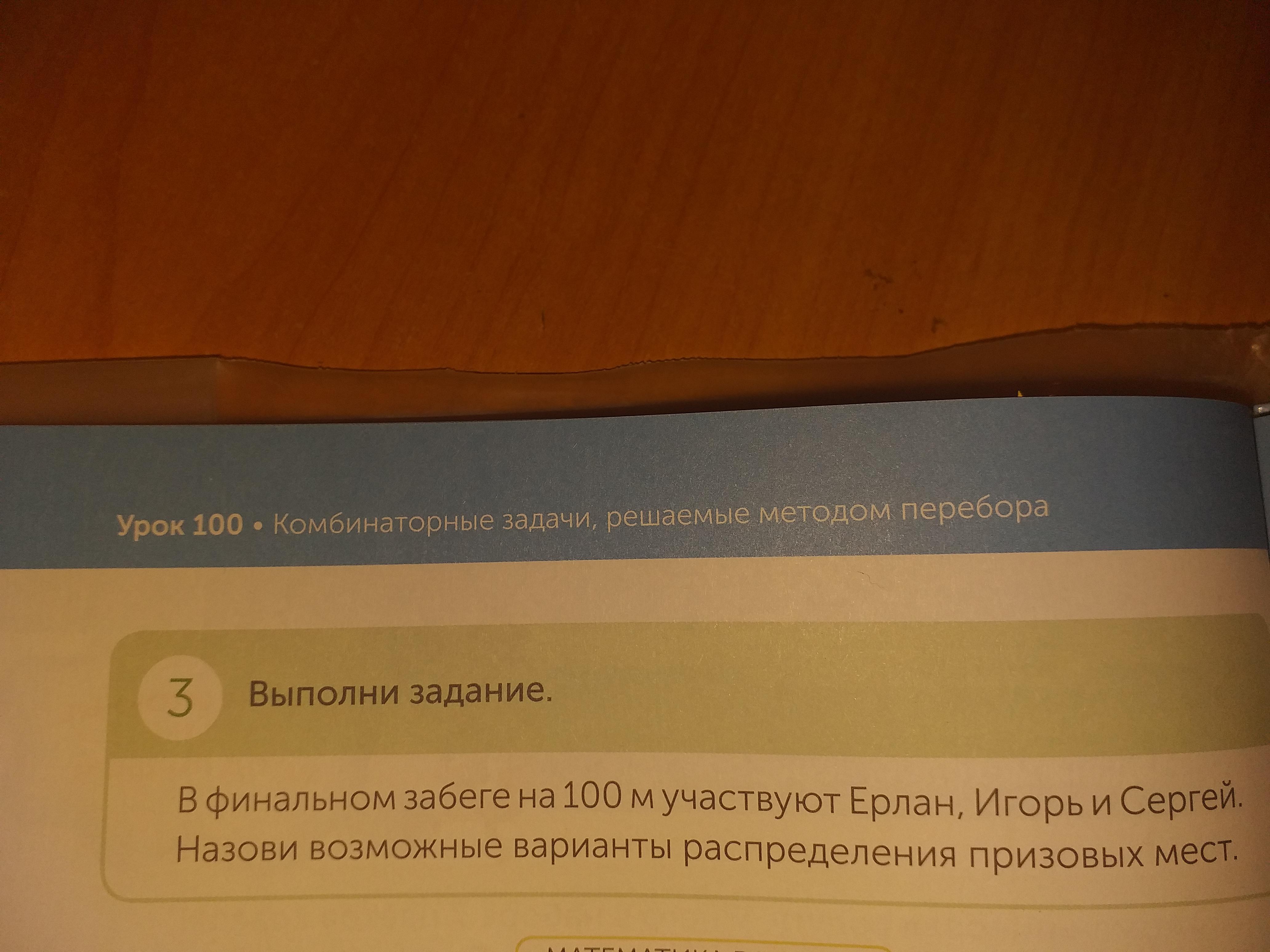 В финальном забеге на 100 м участвуют Ерлан,Игор и Сергей.Назови возможные варианты распределения призовых мест.
