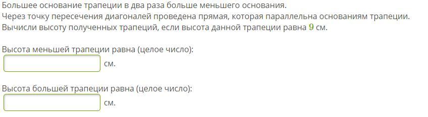 Вычисли высоту полученных трапеций, если высота данной трапеции равна 9 см.