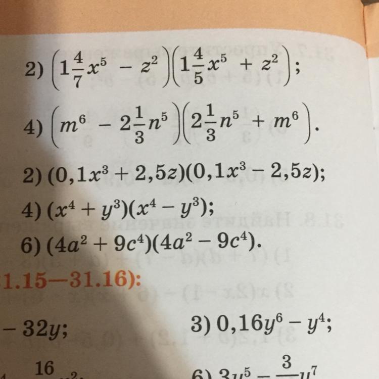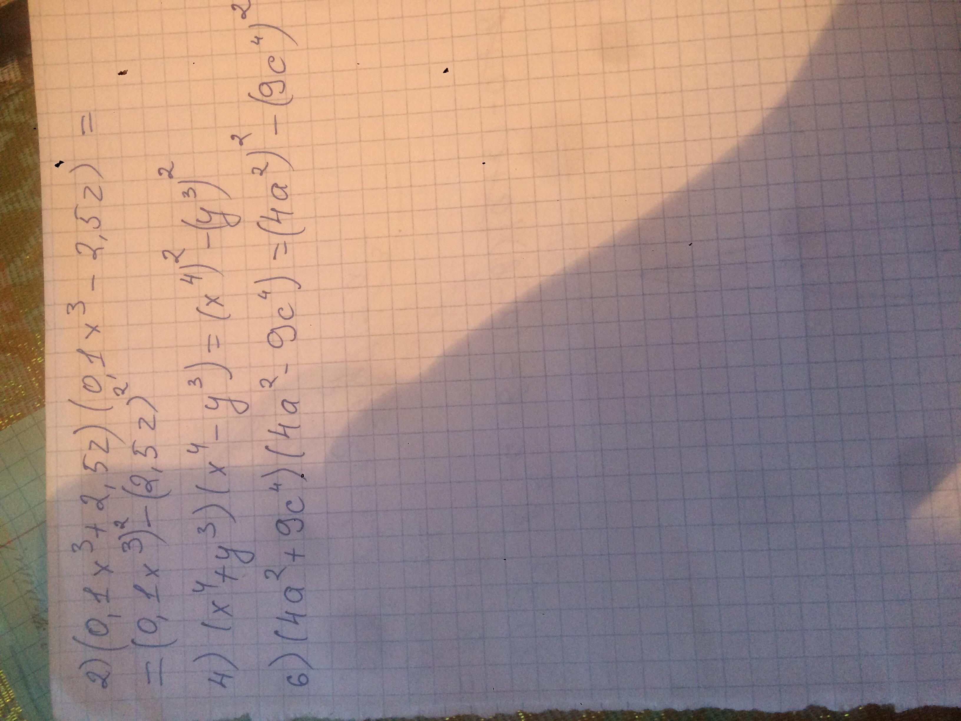 Выполните умножение :2)(0,1x^3+2,5z)(0,1x^3-2,5z)