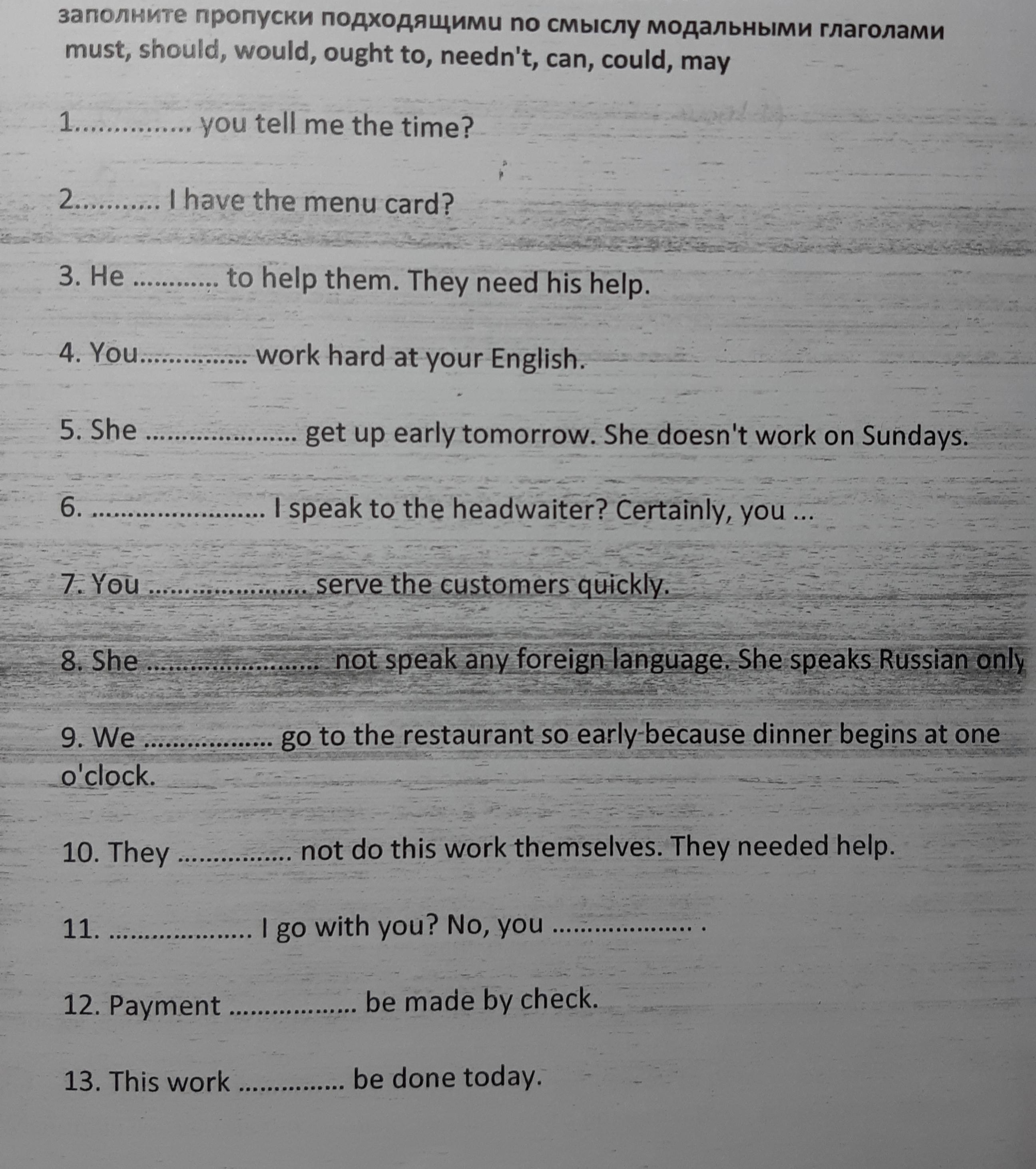 1.сould 2.may 3.should 4.must 5.needn't 6.may, may 7.must 8.can 9.ought to 10.could 11.can, can't 12.can 13.can