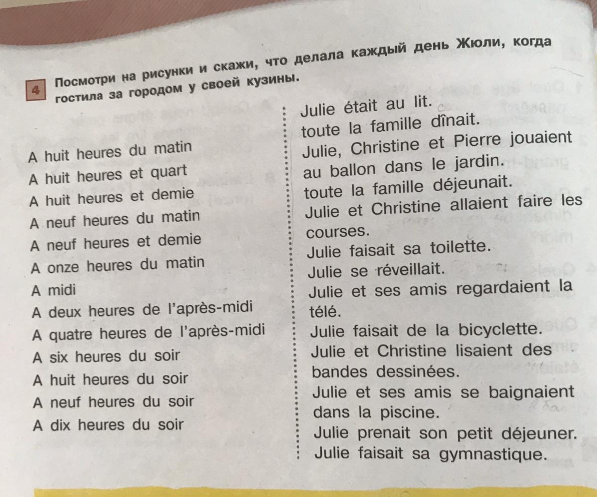Джули была в кровати. вся семья обедала. Джули, Кристина и Пьер играли в мяч в саду. вся семья обедала. Джули и Кристина пошли делать работу в восемь утра в четверть девятого, в половине девятого в девять утра в половине десятого. Джули мыла. Джули проснулась. Джули и ее друзья смотрели телевизор. В одиннадцать часов утра. В полдень. В два часа дня. В четыре часа дня по телевизору. Джули ехала на велосипеде. Джули и Кристина читали комиксы в шесть вечера. В восемь вечера. Джули и ее друзья плавали в бассейне. Джули завтракала. Джули сделала ее гимнастику. В девять вечера в десять вечера