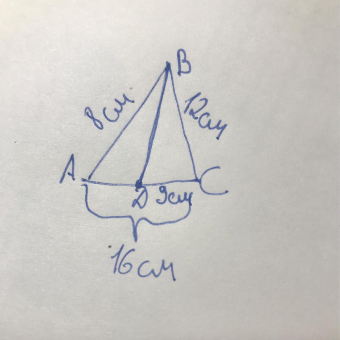 в треугольнике abc известно, что AB=8 см, BC=12 см, AC=16 см На стороне AC отметили точку D так, что CD=9 см. Найдите отрезок BD