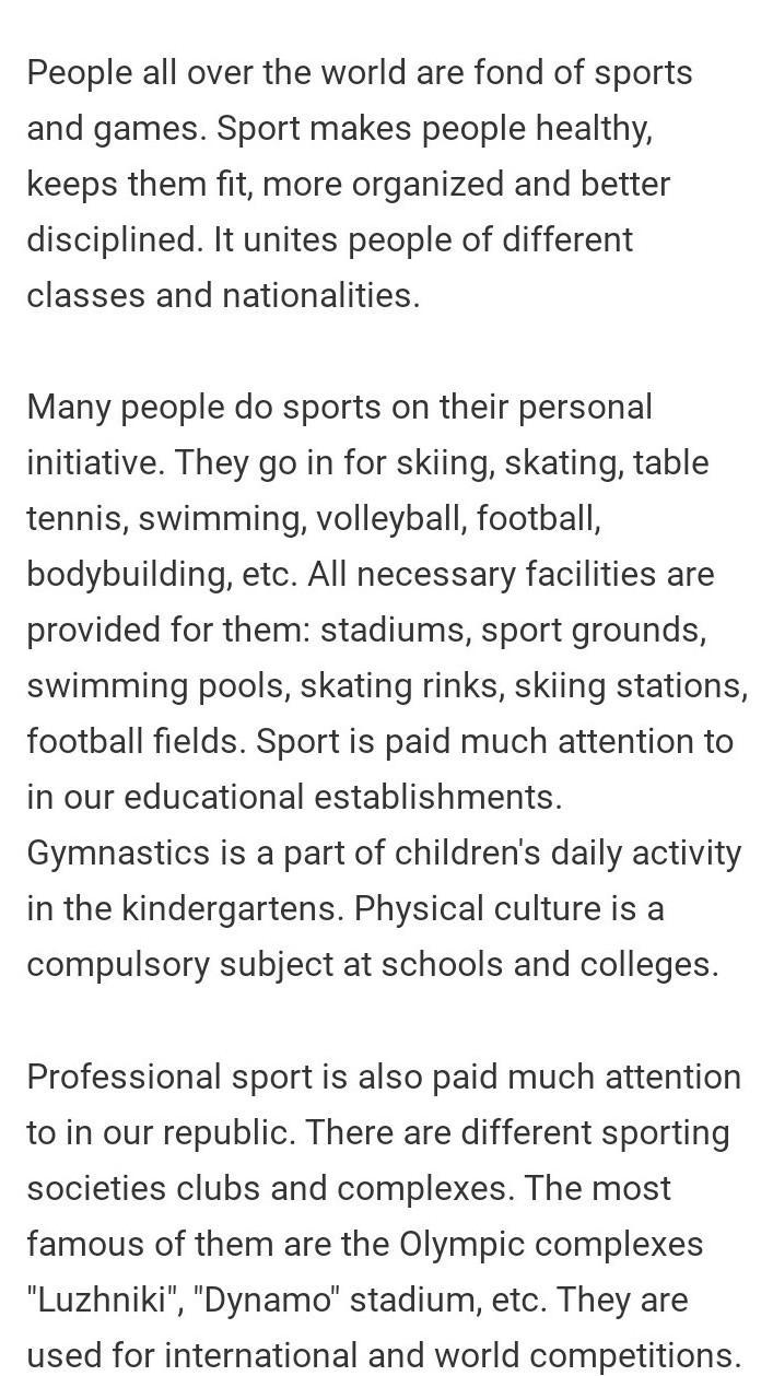 Люди всего мира любят спорт и игры. Спорт делает людей здоровыми, держит их более организованными и дисциплинированными. Она объединяет людей разных классов и национальностей.